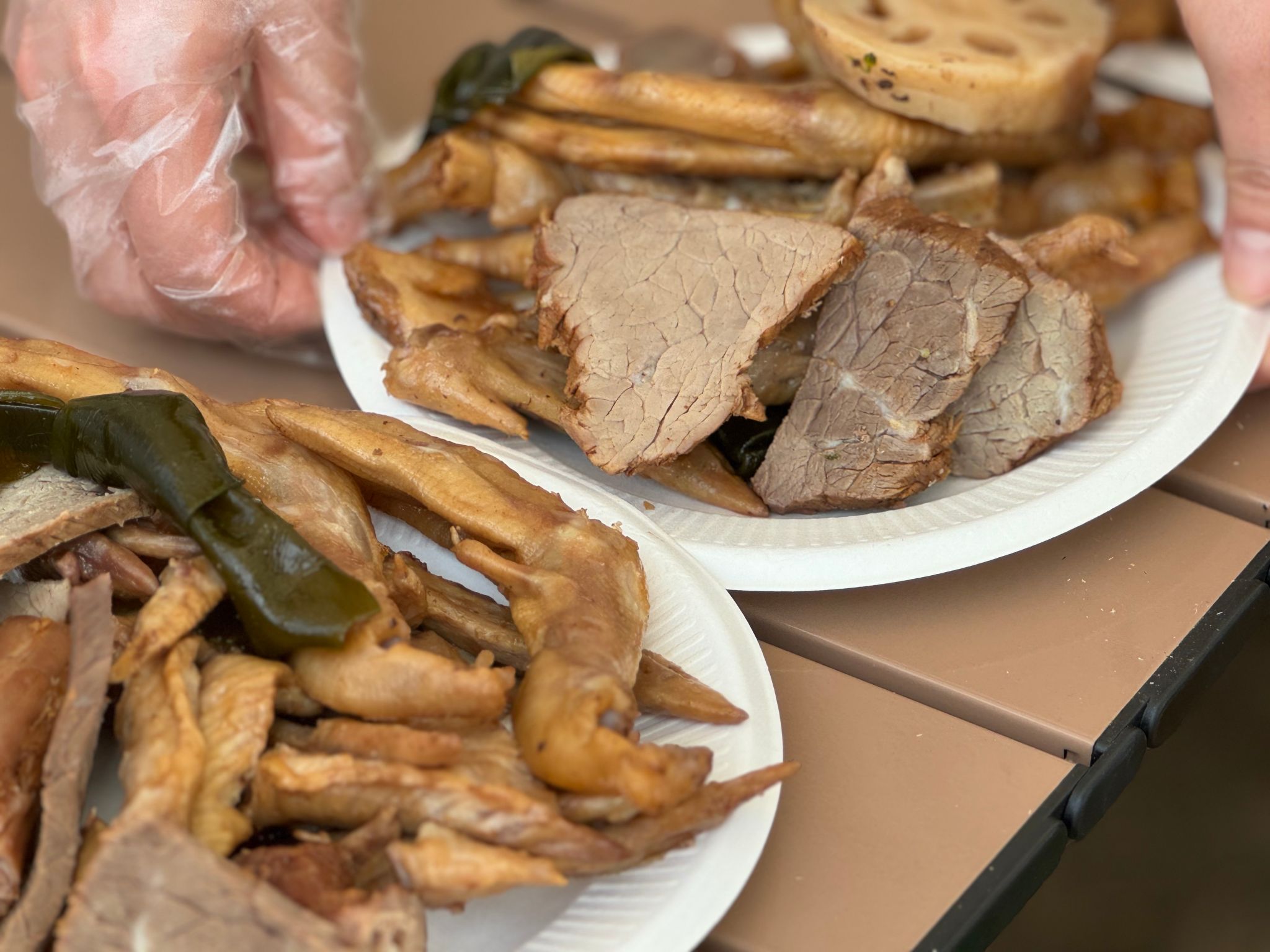 饺子与抄手在沸水中沉浮出锅后,又翻腾起重庆小面,碗沿堆着辣椒面与秘制佐料。烧烤架上荤素交替,肉串与金针菇裹着孜然金边,在铁网上滋滋作响。托盘里码着酱色鸡爪、琥珀鸭掌、卤牛肉片,素海带结与藕片浸润在红油里。水果区还有诱人的“解暑神器”。