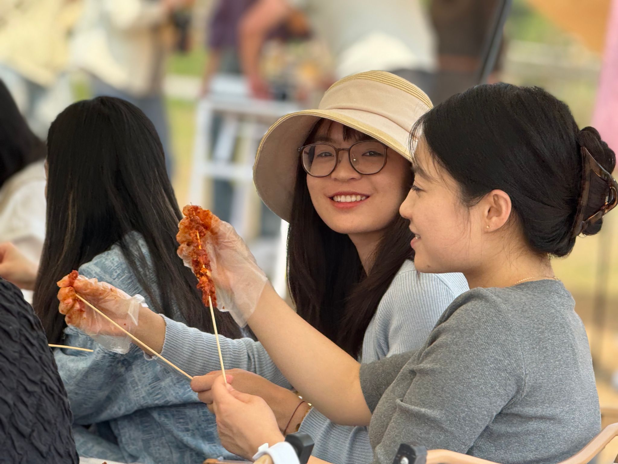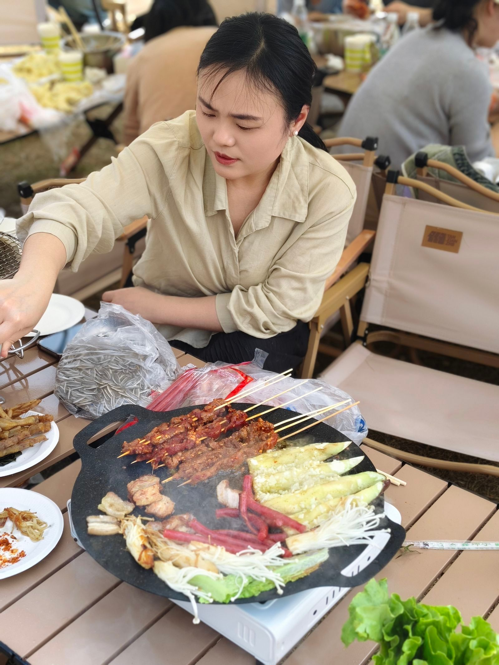 天幕下人影交错:有的老师握着肉串热辣滚烫,有的老师夹着海带结往小面碗里添配菜,指尖还沾着烧烤料的辛香。在这场春日里的风味交汇,终在杯盘轻响中酿出片刻闲适。