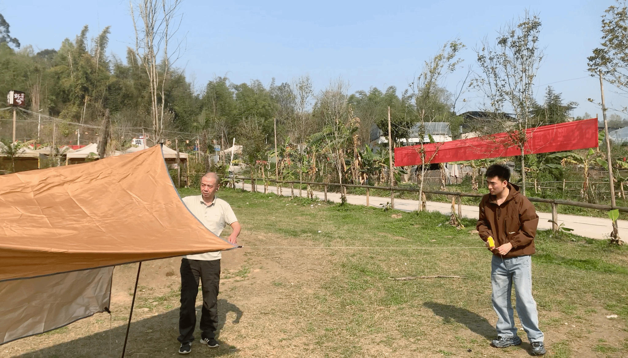 晨光中的江滩迎来特殊施工队,有的老师抡锤架势堪比专业工匠,有的老师拉绳测量角度如同处理精细事务。团队老师们通力合作,有的老师一边抡锤一边分享学生矛盾处理经验:“地钉斜45度入土最稳固,就像找准问题切入点才能有效沟通。”搭建完成的天幕被老师们笑称为“移动的学工办公室”,粼粼波光映照着劳动智慧。