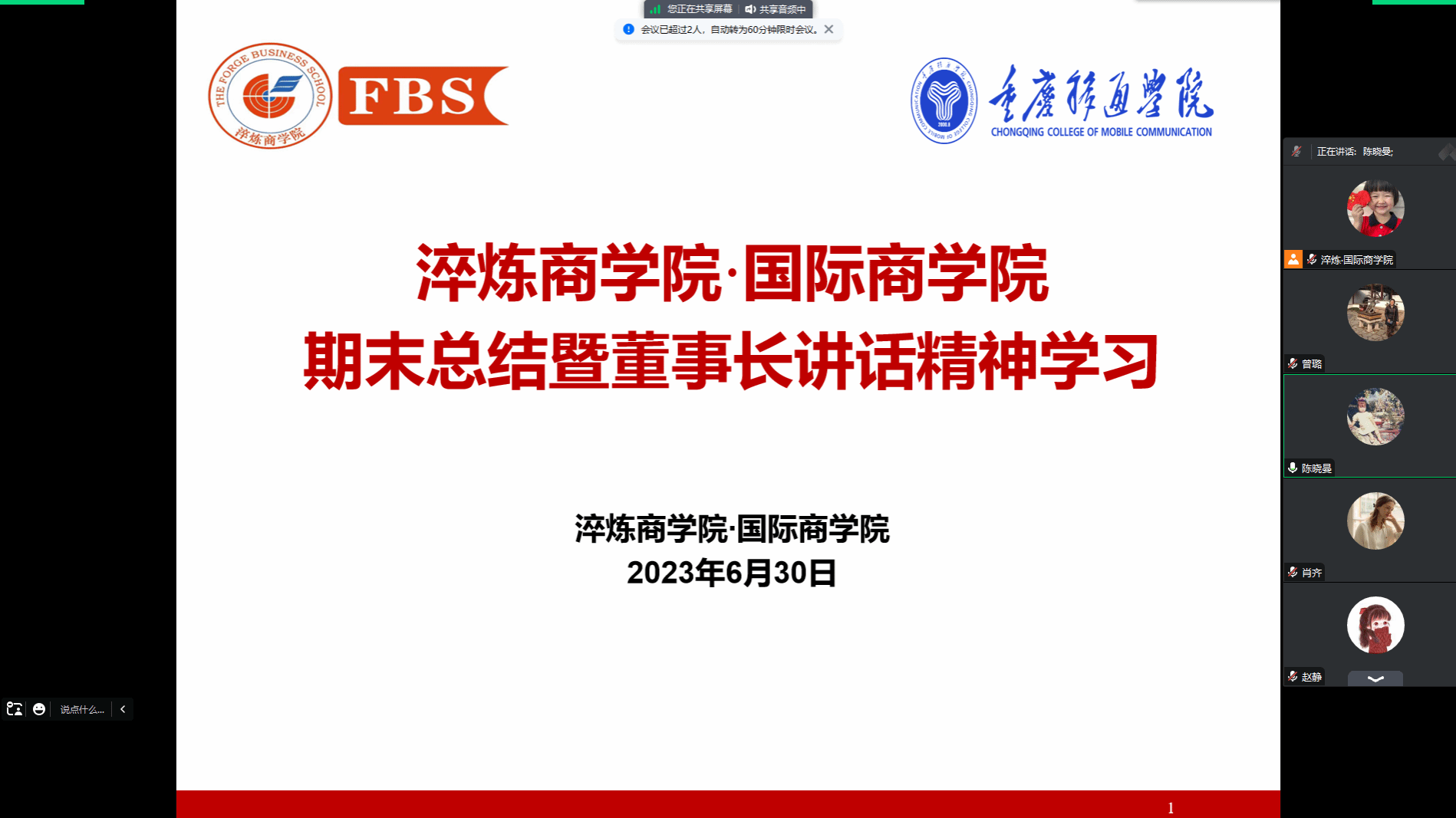 为了更好地领会董事长讲话精神,同时加强师资队伍建设,总结经验、展望未来,6月30日上午,淬炼商学院·国际商学院线上组织开展期末总结暨董事长讲话精神学习专题会议。本次会议由学院副院长曾璐主持并主讲,学院全体教职工参加。