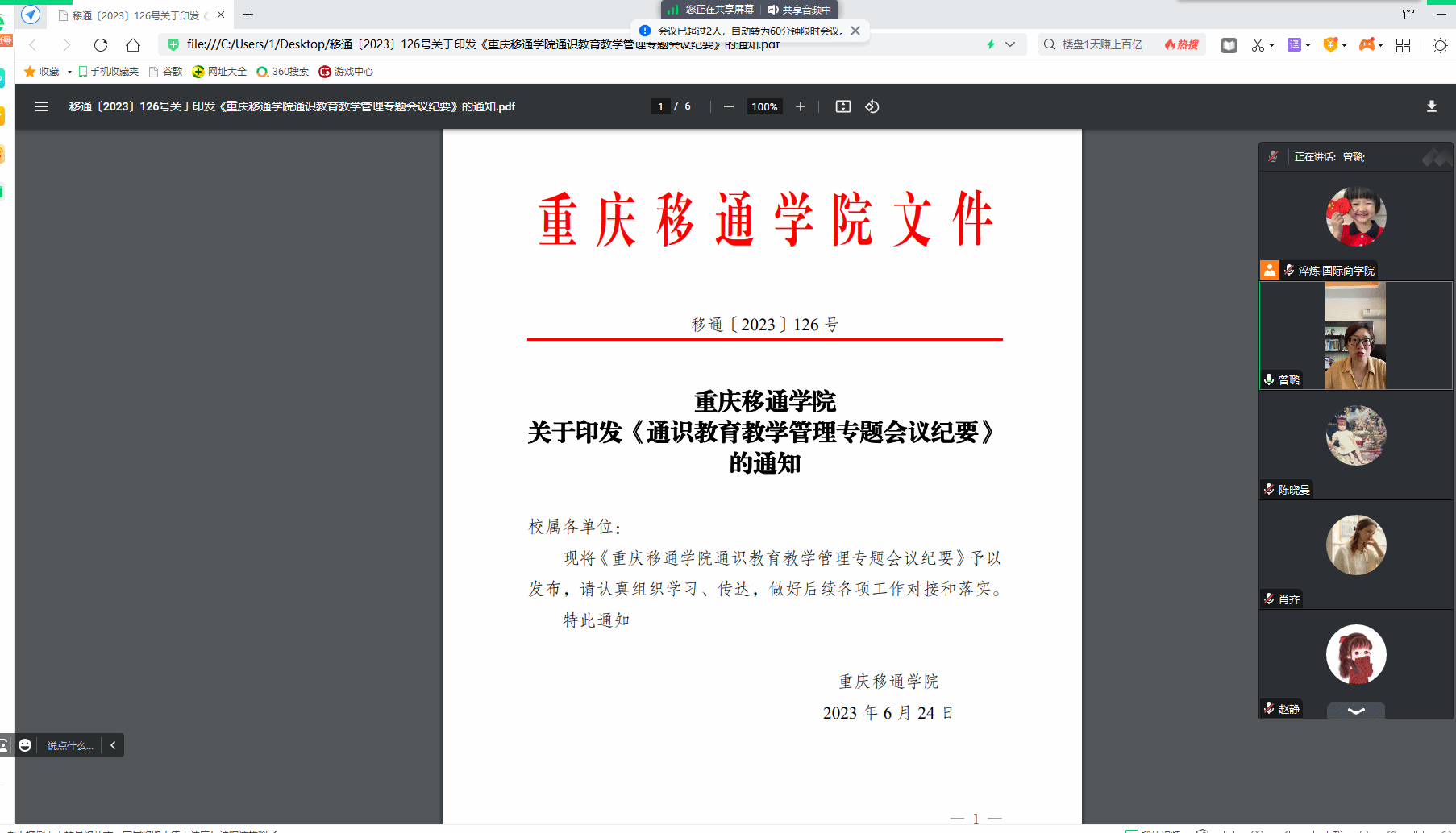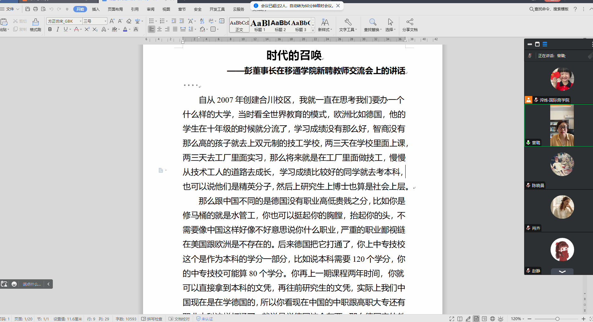 最后,总结经验,展望未来,曾院长带领大家集体学习《响应时代的召唤—彭董事长在移通学院新聘教师交流会上的讲话》,以及《重庆移通学院通识教育教学管理专题会议纪要》,希望全体教师认真研读、深入领会董事长的讲话精神,并结合自身工作实际,以饱满的热情,端正的态度,踏上未来的新征程,披荆斩棘、勇往直前。