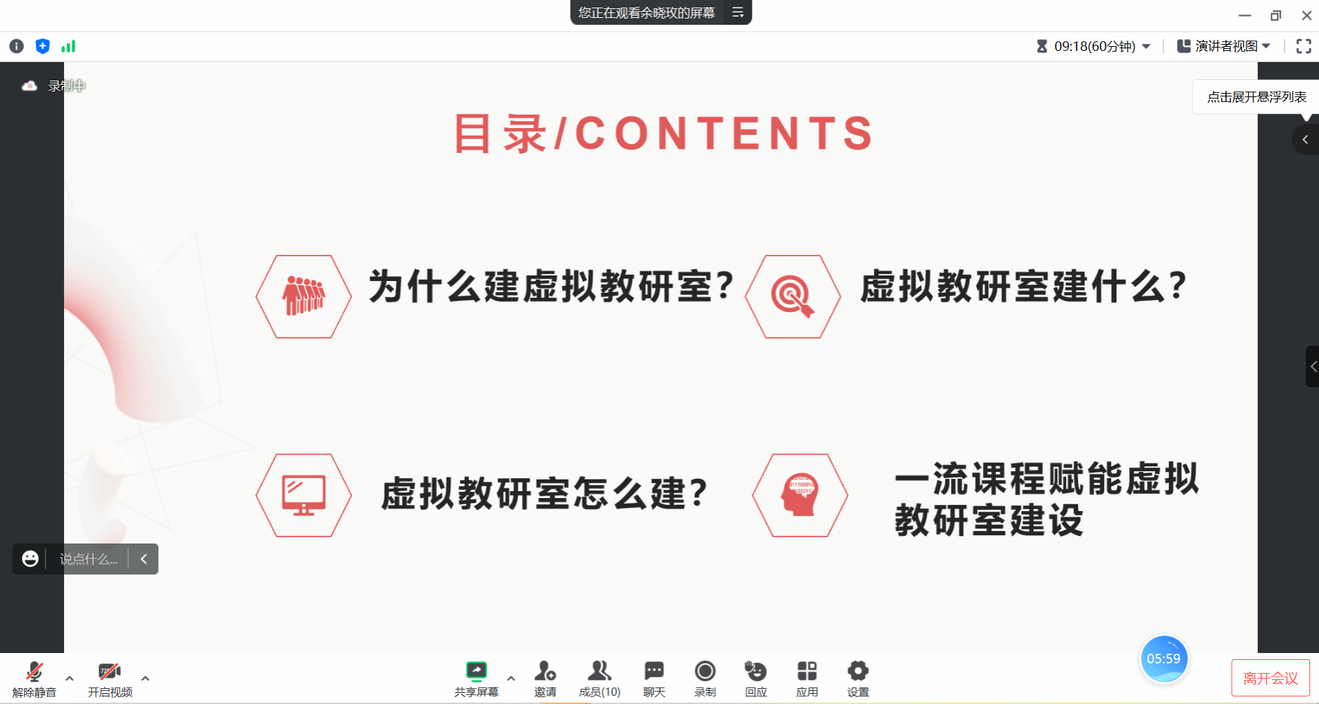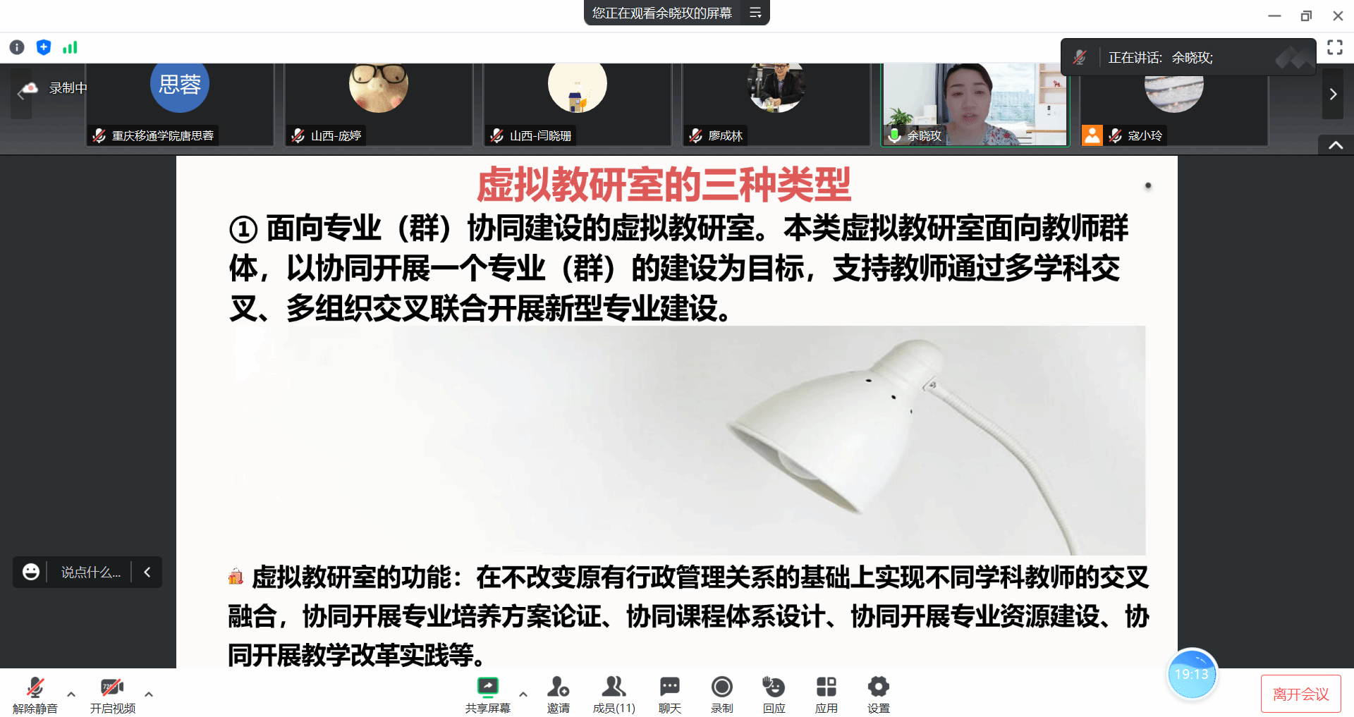 为什么建虚拟教研室、建什么、怎么建、一流课程如何赋能虚拟教研室,余老师通过两个小时的分享,对以上问题做出了鲜明扼要的回答。首先,余晓玫老师介绍了重庆市虚拟教研室试点建设的原则:坚持立德树人、坚持协作共享、坚持分类探索、坚持示范引领。其次,余老师针对重庆市的虚拟教研室建设内容进行了详细的分析和解读。余老师提到,重庆市虚拟教研室主要是包括三类:专业建设类、课程群类和教学研究改革类。虚拟教研室的建设与发展,有助于实现不同学科教师的交叉融合,丰富课程内涵、提升教学质量,有助于开展新范式的探索实践。随后,余老师介绍了国内其他高校虚拟教研室建设的成功经验,这些经验在建设虚拟教研室时都可以借鉴参考。最后,余老师重点讲述了如何建设虚拟教研室。余老师表示,虚拟教研室首先要有一个明确的建设目标,促进跨区域的教研体系建设,逐步实现转型,明确虚拟教研室的建设重点;其次要确定建设计划、科学开展工作;此外,还要重视课程思政,实现全方面育人。另外,余老师针对一流课程建设思路进行了全方位、多方面分享。余老师的分享精彩深入,受益匪浅。