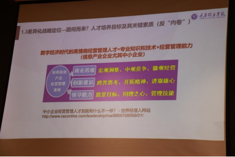 本次讲座让《“互联网+”时代的企业战略管理》课程小组同学们对重庆移通学院的战略定位和管理有了更直观和充分的了解,为各课程小组研究重庆移通学院战略管理和撰写《重庆移通学院企业战略分析报告》提供了更详实的一手资料,有效的推动了新商科课程改革。本次活动切实践行了“商科课程+信息产业+完满通识艺术+实战项目+大师课(Learning by doing)”的 “新商科”模式,从而真正做到知行合一、理论与实践相结合。