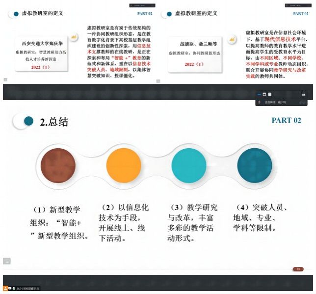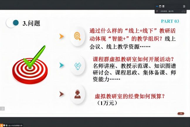 寇老师对虚拟教研室的定义进行了分享。在教育部的相关文件中,并没有提到具体的虚拟教研室的定义,仅有部分高校、专家和学者对虚拟教研室进行了定义。在分享了南开大学李川勇、西安交通大学郑庆华、占德臣和聂兰顺以及陈文智等学者、以及相关文献中的定义之后,寇老师对虚拟教研室进行了总结。最后,寇老师提出了目前面临的问题:第一,通过什么样的线上线下教研活动来体现“智能+”的教学组织;第二,作为一个课程群虚拟教研室,我们该如何开展活动,是否可以借助其他虚拟教研室开展的名师讲座、教授示范课、知识图谱研讨会、课程思政、集体备课等系列活动;第三,经费预算如何分配。