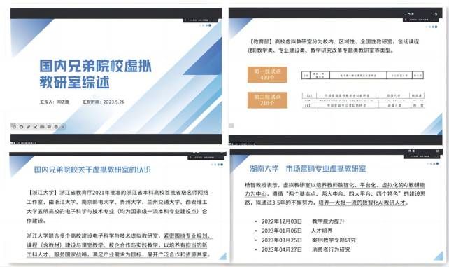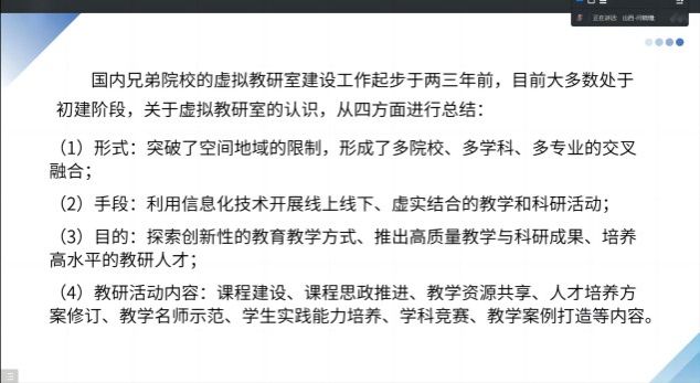 晋中信息学院闫晓珊老师对国内兄弟院校虚拟教研室的资料和相关文件进行汇报。在通过的两批试点建设名单637个虚拟教研室中,仅有3个是和市场营销相关的,分别是东北财经大学“电子商务概论课程虚拟教研室”、华侨大学“市场营销课程教学虚拟教研室”和湖南大学“市场营销专业虚拟教研室”。接着,闫晓珊老师对这三个学校关于虚拟教研室的定义和教研室的建设进行了分享。此外,闫晓珊老师又分享了浙江大学、商丘师范学院、四川工业科技学院、济宁学院等院校关于虚拟教研室的认识。最后,闫晓珊老师讲道:“国内兄弟院校的虚拟教研室建设工作起步于两三年前,目前大多数处于初建阶段”,并从形式、手段、目的和教研活动内容四个方面对虚拟教研室的定义进行了总结。