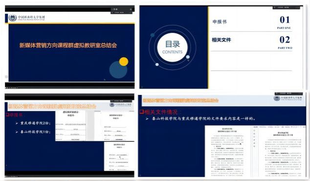 泰山科技学院杨洁青老师对三校四区有关“虚拟教研室”的申报书及建设工作的相关文件作了总结汇报。目前,重庆移通学院有“案例式教学创新改革虚拟教研室”和“新媒体营销方向课程群虚拟教研室”2份申报书,泰山科技学院有“会计专业虚拟教研室”1份申报书。接着,杨洁青老师阐述了各校关于虚拟教研室建设的工作方案。
