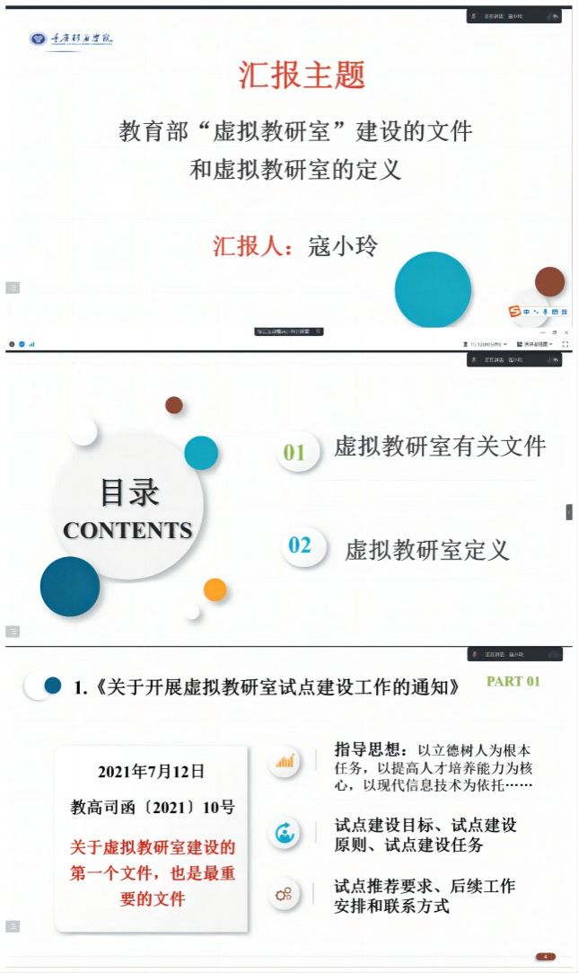 重庆移通学院寇小玲老师从教育部虚拟教研室有关文件和虚拟教研室定义两方面进行了汇报。首先,寇老师对教育部虚拟教研室的文件《关于开展虚拟教研室试点建设的通知》、《教育部办公厅关于公布首批虚拟教研室建设试点名单》、《教育部办公厅关于公布第二批虚拟教研室建设试点名单的通知》进行了解读。文件从虚拟教研室建设的指导思想、试点建设目标、试点建设原则、试点建设任务等,以及加快推进试点建设工作、广泛开展研究交流活动、加强建设质量监测和评价相关事宜都作了介绍。《关于开展虚拟教研室试点建设的通知》是第一个有关虚拟教研室建设的文件,也是最重要的一个文件。此后,教育部高等教育司先后公布了两批虚拟教研室建设试点名单。目前,虚拟教研室由于建设时间较短,各高校都还处在探索阶段。