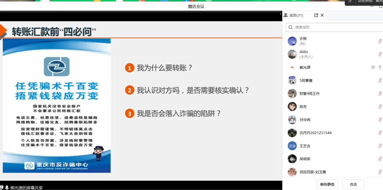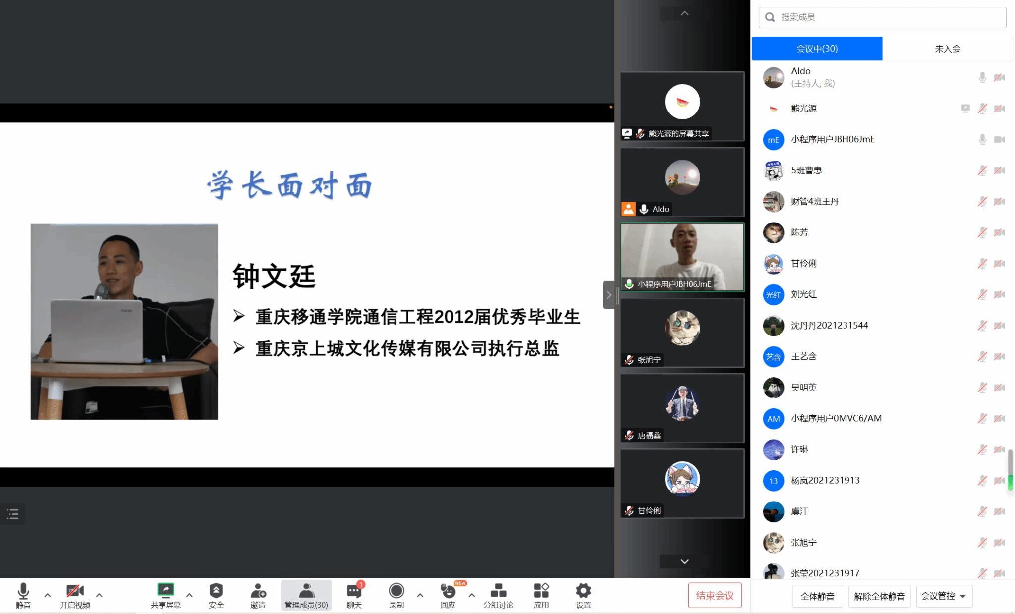 活动伊始,导师们用“学如逆水行舟,不进则退”鼓励同学们在职业生涯中不断学习和进步,不断提高自己的职业素养和综合能力。接着,导师团队为同学们开设了反诈宣讲环节,以求职过程中的防诈反诈为切入点,让同学们了解了各种诈骗的类型,并讲解了反诈技巧。对于防范诈骗,导师们给出的建议是“防微杜渐”、“心理建设为先”、“警钟长鸣”、“不要贪小便宜”等等。在最后的“学长面对面”环节,导师们邀请到移通学院2012届优秀毕业生、校企合作单位重庆京上城文化传媒有限公司执行总监钟文廷作为嘉宾,与同学们进行面对面交流。钟文廷学长分享了自己的职场经验和技巧,让同学们了解职场环境和面试技巧,并介绍了职场个人权利保护的知识,让同学们了解自己的权利和利益,提高自我保护能力。