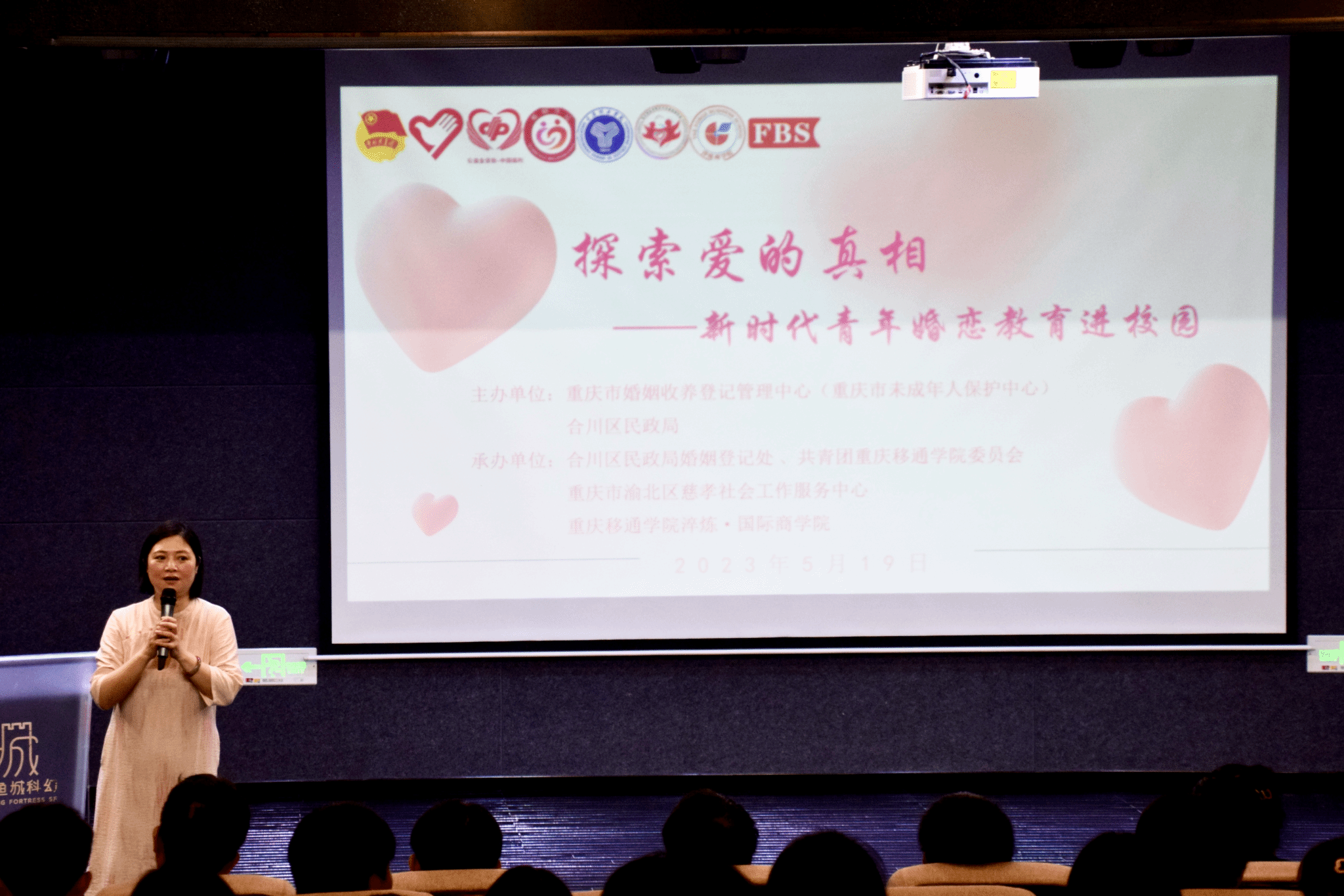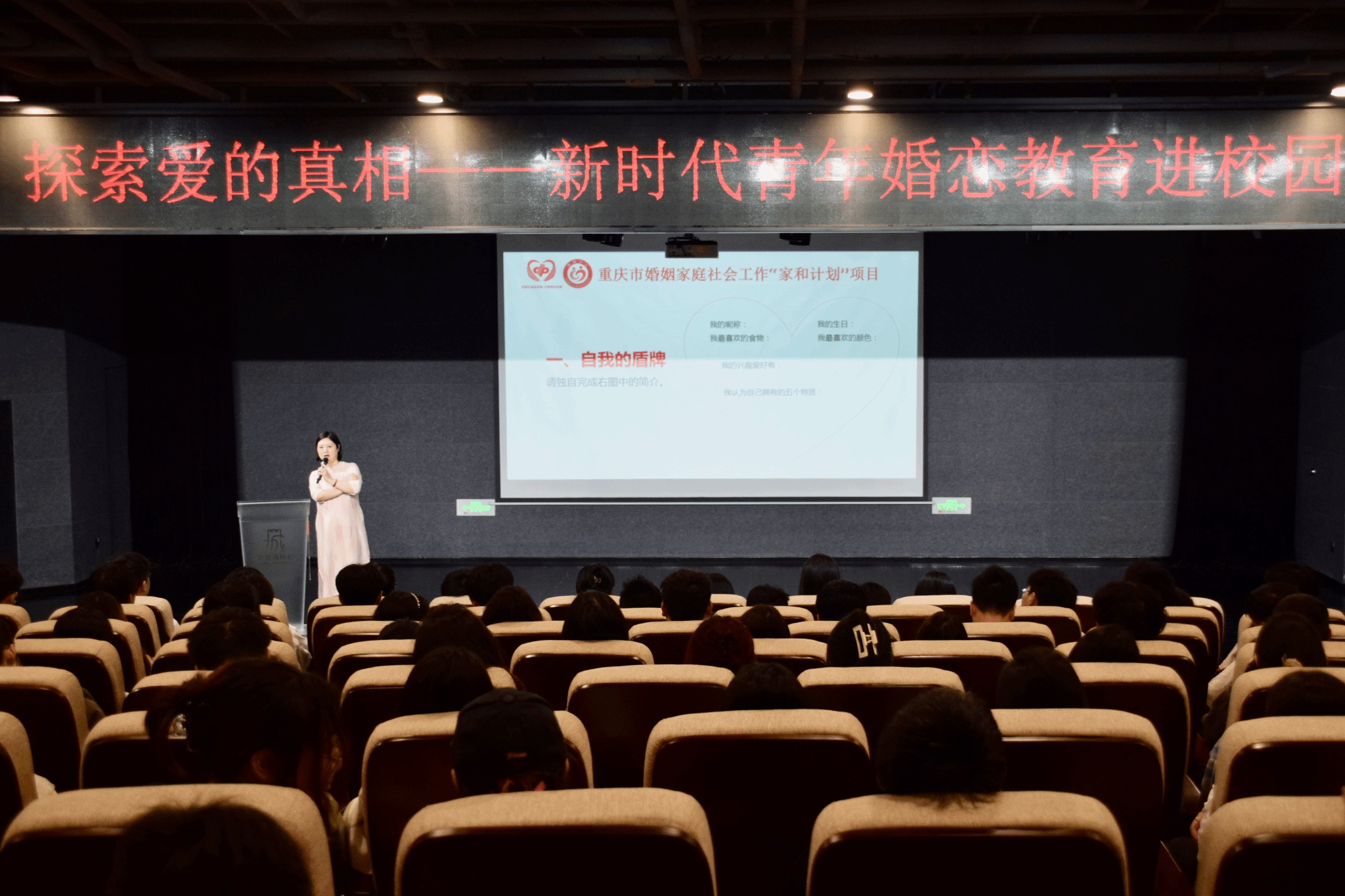 为了引导青年树立健康文明的爱情观、婚恋观、家庭观,异科导师刘月携手汪小丁、王世武、杨婕、吴静、杨敏、李凤勤6名异科导师,组织异科班级同学于5月19日在六度空间·大学生发展中心-黑匣子剧场参加由校团委、淬炼·国际商学院联合合川区民政局、渝北区慈孝社会工作服务中心举办的“探索爱的真相——新时代青年婚恋教育进校园”活动。通过学习爱情基本理论,帮助青年大学生了解恋爱中的激情、真爱与承诺,辨识激情、迷恋与真爱的区别,探索自己的婚恋观与关系模式。