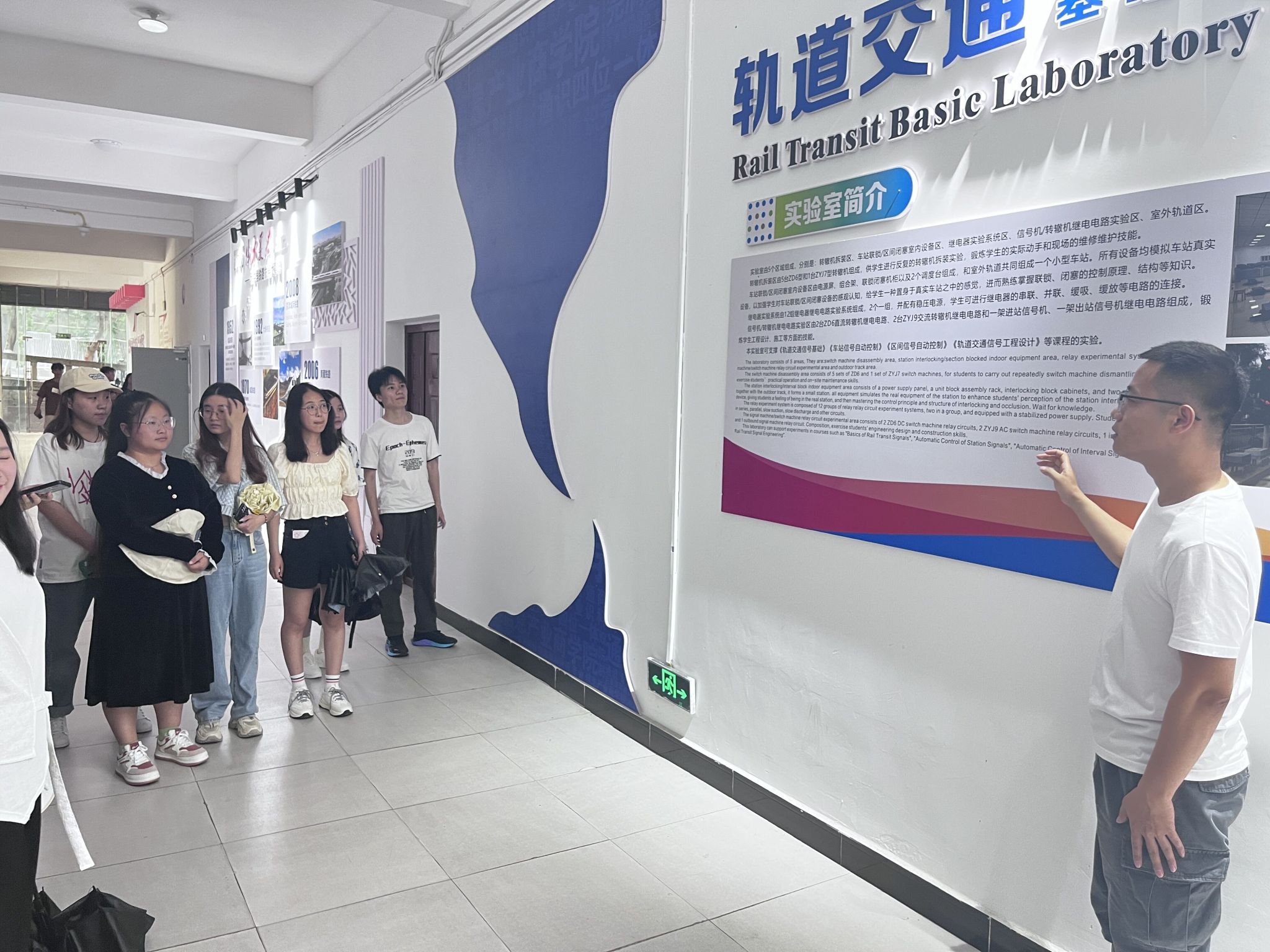 在参观实验室之前,韩冰老师介绍了中国轨道交通发展的历程,从0.5公里的“展示铁路”到“八纵八横”的铁路交通网构建完毕,从“龙号”机车到时速350公里的高速列车,再到拥有自主知识产权的中国标准动车组“复兴号”,中国铁路发展史,见证了一个国家的百年巨变。韩冰老师告诫同学们作为新时代青年要努力扎根于国家发展建设,迎接机遇挑战,勇担历史使命,无论以后从事哪个行业,都要坚守岗位、冲锋在前,用最朴实的行动展现青年人的担当。