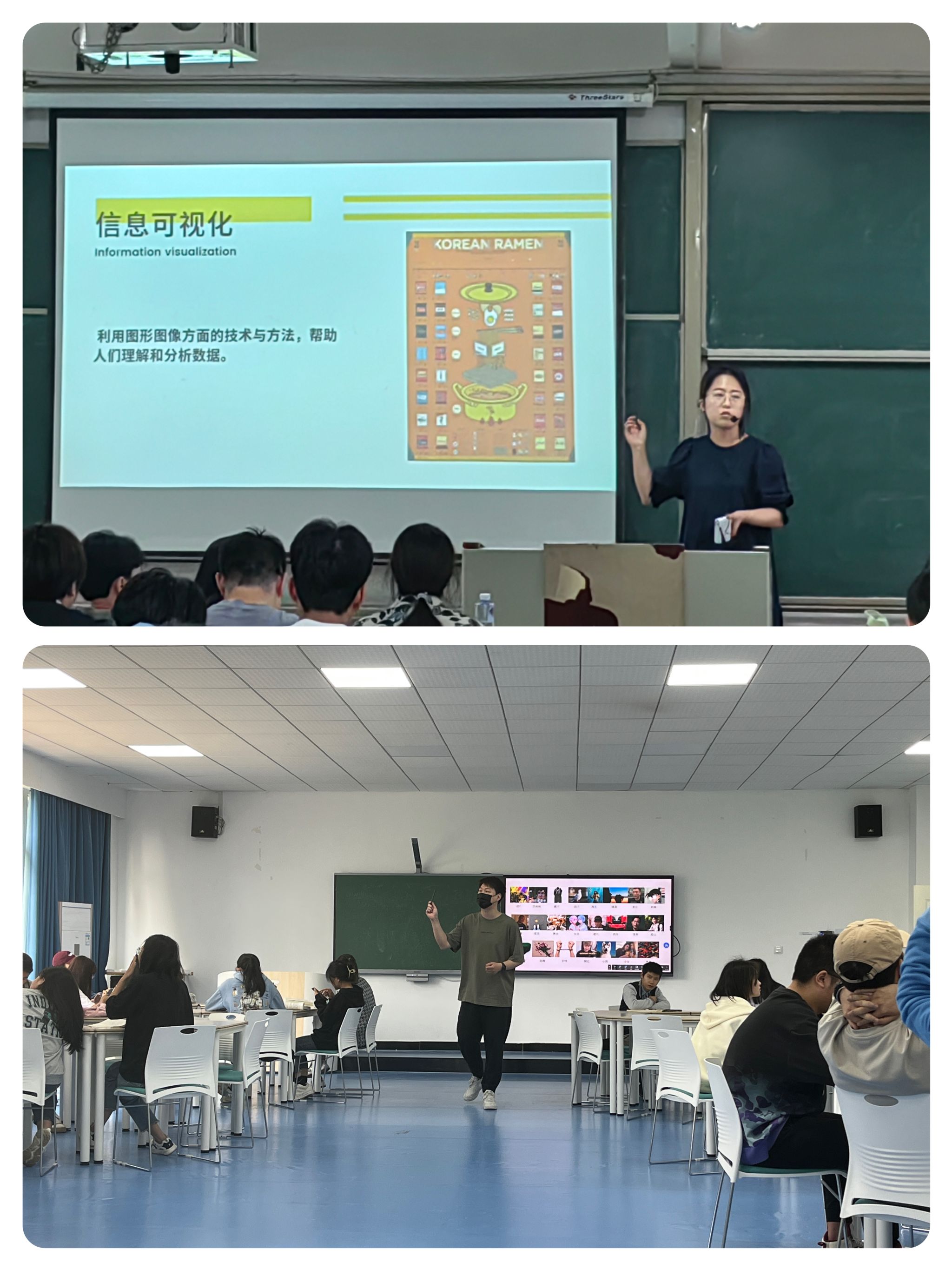 商业与艺术并不是一个矛盾体,商业的介入不但能影响艺术设计的创作,在很大程度上,商业为艺术传播提供了坚实的平台。同样,艺术与商业的碰撞也能赋予商业更多的可能性。基于此,艺术传媒学院两位教师从视频和图文设计与制作角度出发,为商学院学生带来了两场别开生面的教学活动,激发了学生的创作思维。例如,金丽琳老师讲解了《信息可视化的主要功能及制作方法》,通过案例分析的方式使学生掌握数据信息的多元化呈现方法,帮助学生利用信息可视化来更快捷有效地从海量数据中提取有用信息,利用图形图像技术对大规模数据进行可视化表达。赵俊杰老师通过对影视基础知识、《剪辑手法“蒙太奇”》的讲解以及案例分析,使学生能够了解蒙太奇方法创造特殊的时间和空间,画面产生新的叙事含义,从而锻炼培养同学们的对比联想思维,帮助商学院学生提高营销与推广的创造性。