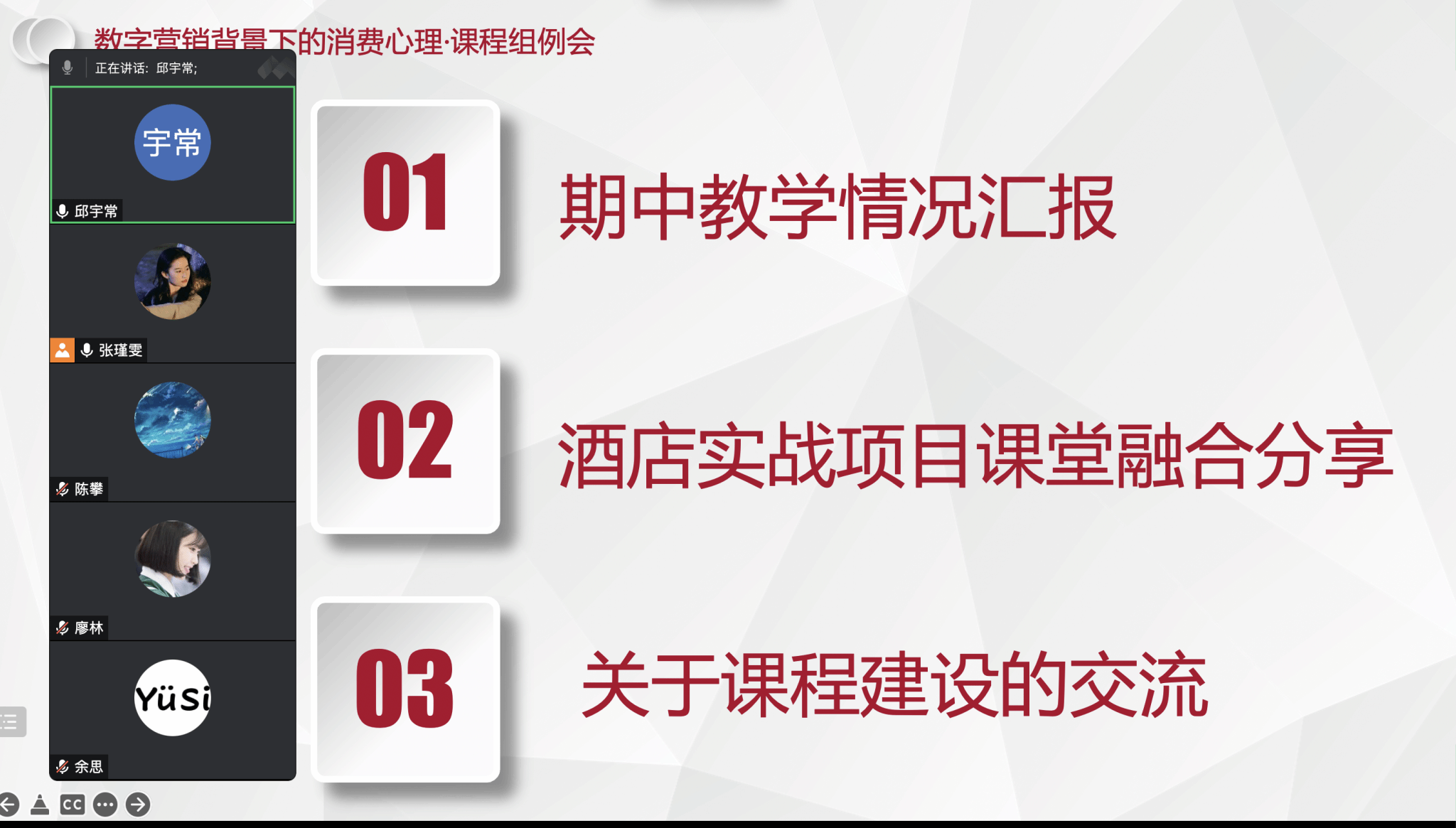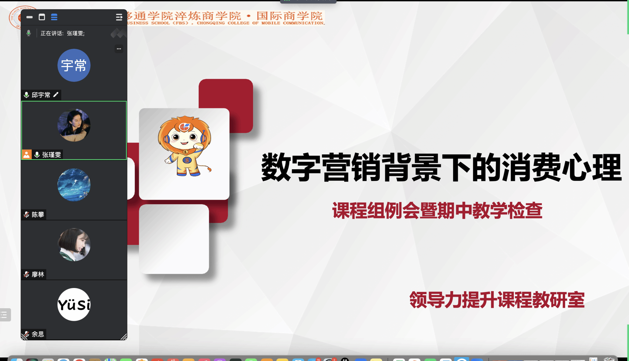 为进一步深化课程教学改革,提升《数字营销背景下的消费心理》课程教学质量与教学效果,并加强课程组老师之间相互交流,4月27日晚,《数字营销背景下的消费心理》课程团队通过腾讯会议召开了课程组例会暨期中教学检查研讨会。会议由课程组负责人邱宇常老师主持,课程组成员张瑾雯老师、陈攀老师、廖林老师、余思老师参与研讨。