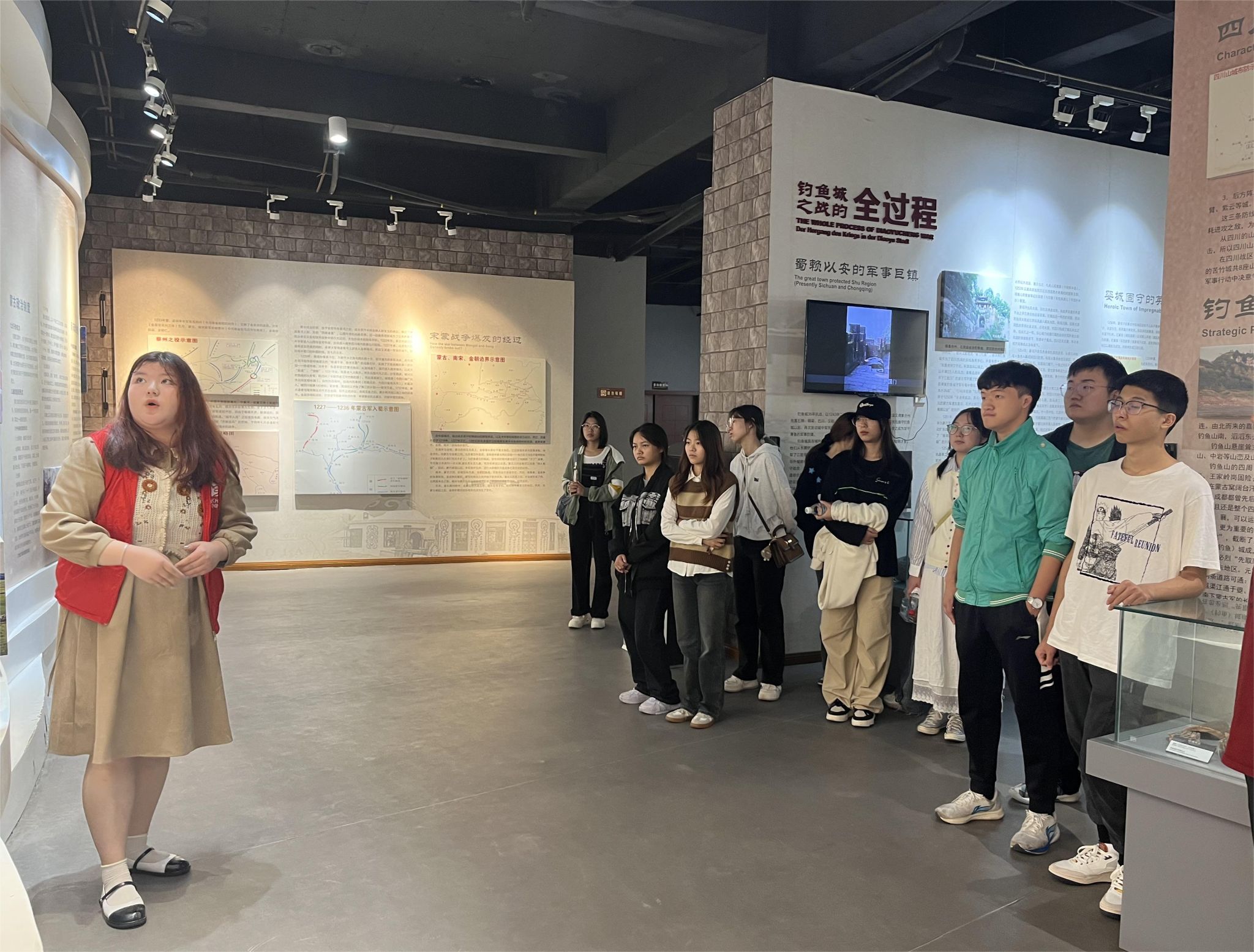 来到二楼,“大事记”为同学们展现了48年宋蒙战争中的重大事件,余玠,王坚等人的英勇事迹再次被提及,同学们认真地听着讲解,当年金戈铁马,战鼓铮铮,点燃同学们的一腔热血。气氛开始升温,同学们不断向讲解员提出问题,后来,所有问题都在讲解员耐心的解释下一一解开了。接下来,在“宋蒙战争中的四川”、“宋蒙政治经济文化各个方面的对比”之中,“宋蒙战争中的四川”,因为地理位置的特殊性更是受到同学们的关注,西南方的最后屏障只有死守才能保住宋朝的最后疆土,宋军英魂也因此多葬于此,英雄末路悲歌奏,后人亦有心痛时。此时,同学们的心情是凝重的。