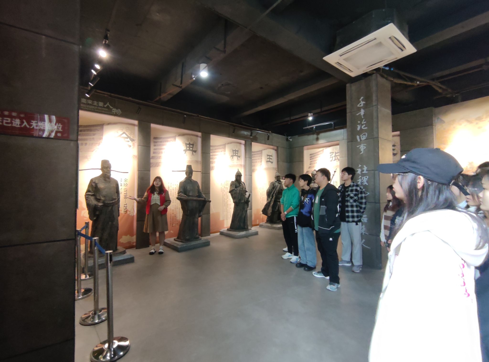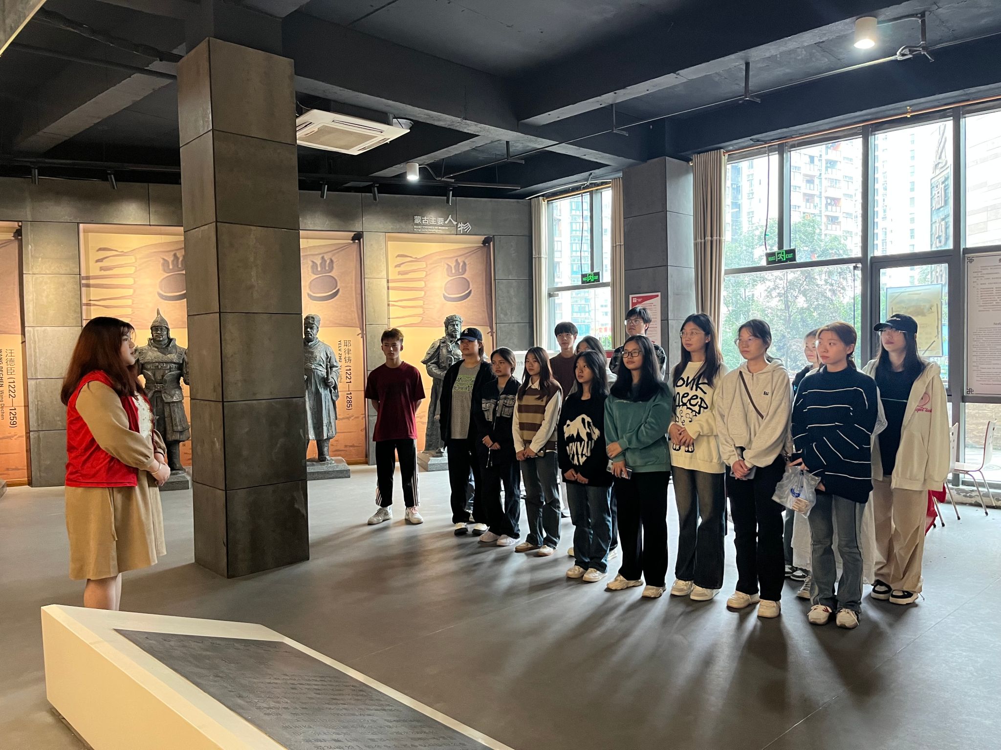 在一楼的大厅中,“鱼城雄魂”四个大字映入同学们的眼帘,就此开始了博物馆之旅。在博物馆讲解员的带领下,同学们来到了“钓鱼城遗址模型”前,立体的遗址模型使同学们对钓鱼城有了初步的印象。紧接着,讲解员将同学们领到了钓鱼城之战中重要将领的塑像前,余玠、冉琎、冉璞、王坚、张珏等爱国将领引起同学们的感慨。