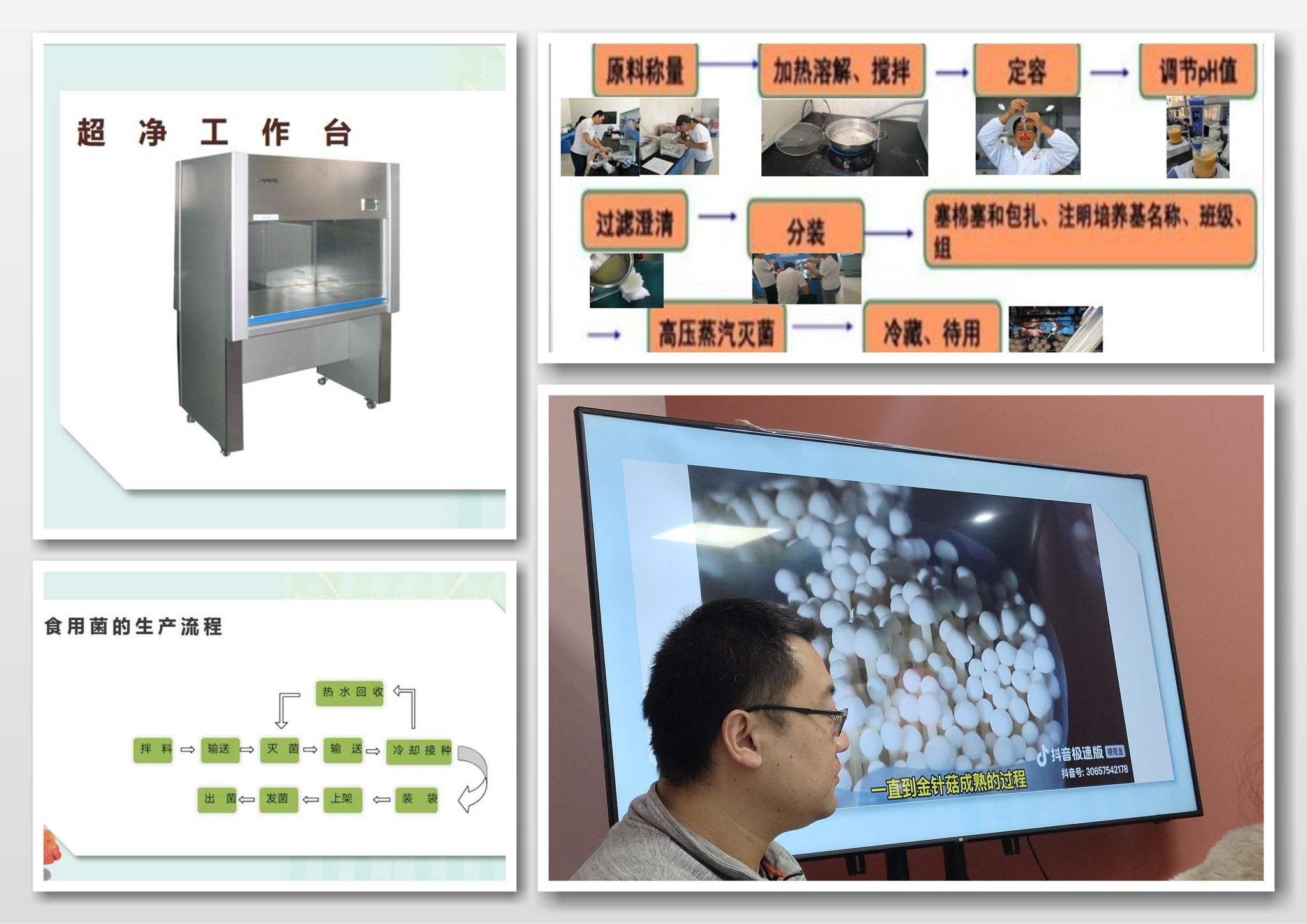 结合食用菌的生产流程视频,胡老师讲解了实验室和培养基如何灭菌,无菌的环境是植物组织培养的必要条件,通过视频和互动提问,让学生明白灭菌所需要的设备以及灭菌原理。