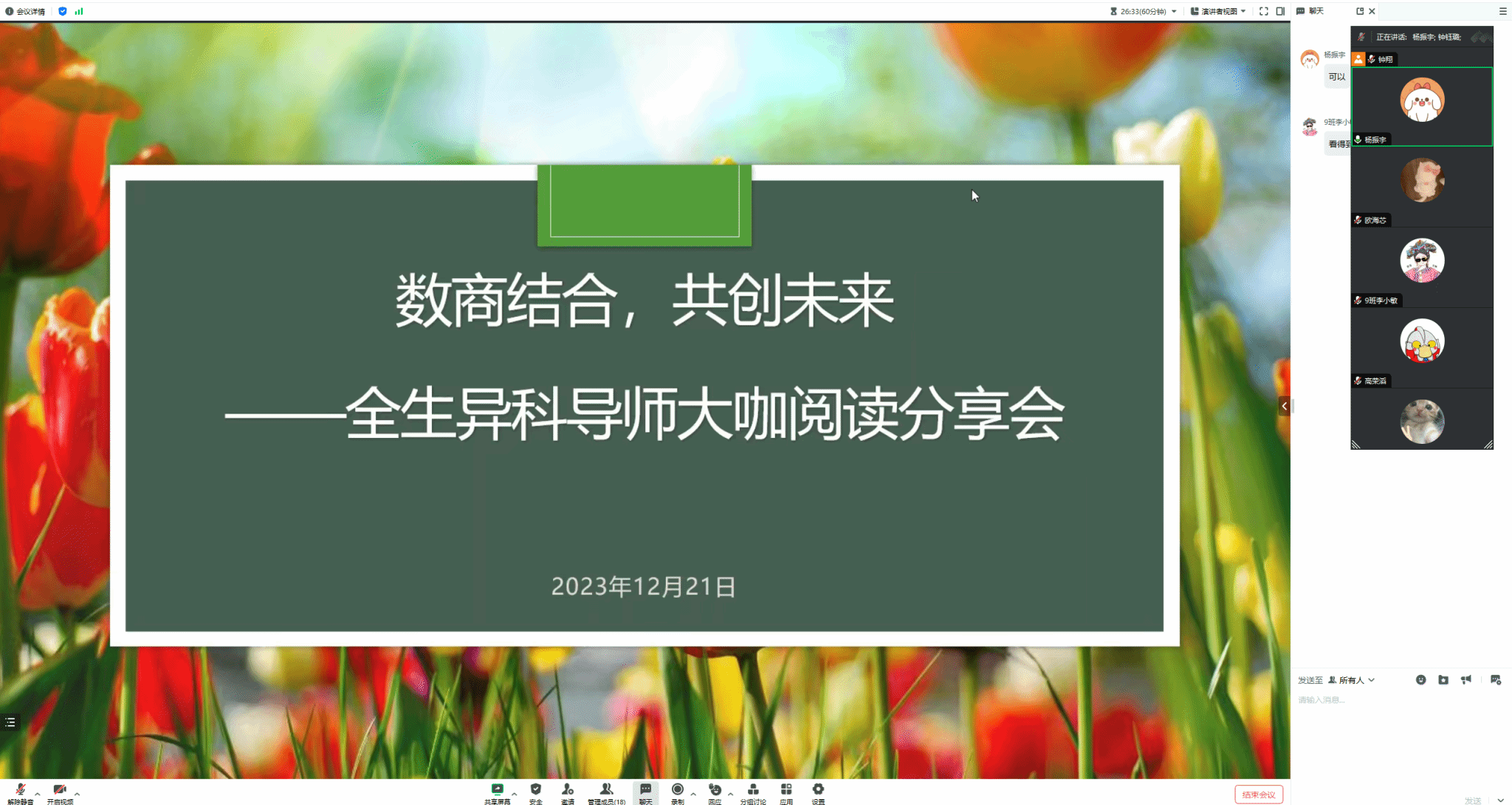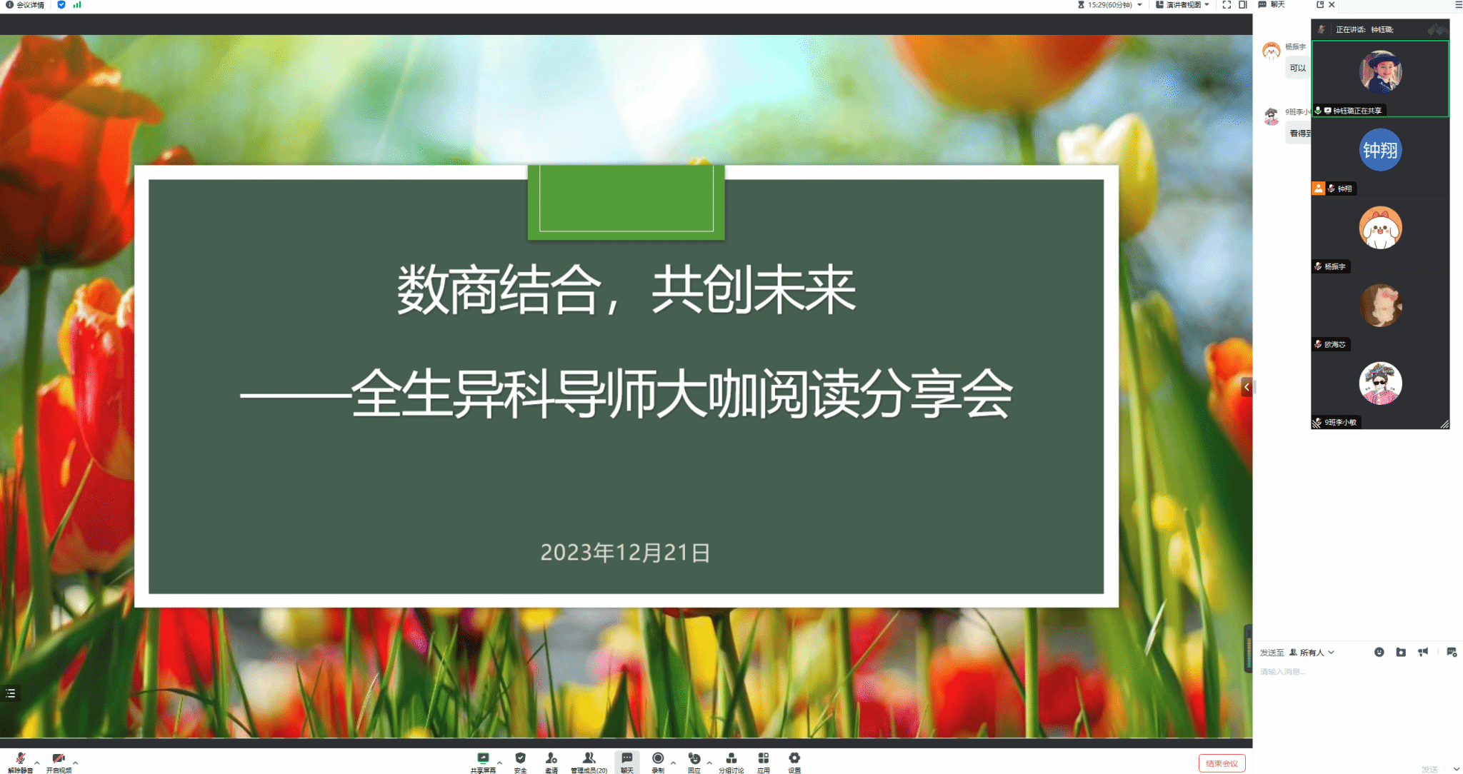 阅读别人的人生,站在巨人肩膀上看世界,才能更好的看见你自己。为培养学生良好的阅读习惯,促进学生全面发展,积极响应我校“信息产业大咖阅读计划”,更好的践行“四位一体”的人才培养模式,以读书活动为载体,钟钰璐异科导师小组成员于12月21日下午通过线上会议的形式与綦江校区的数字经济与信息管理学院的同学进行“数商结合,共创未来”为主题的跨校区跨学院交流的大咖阅读分享会。