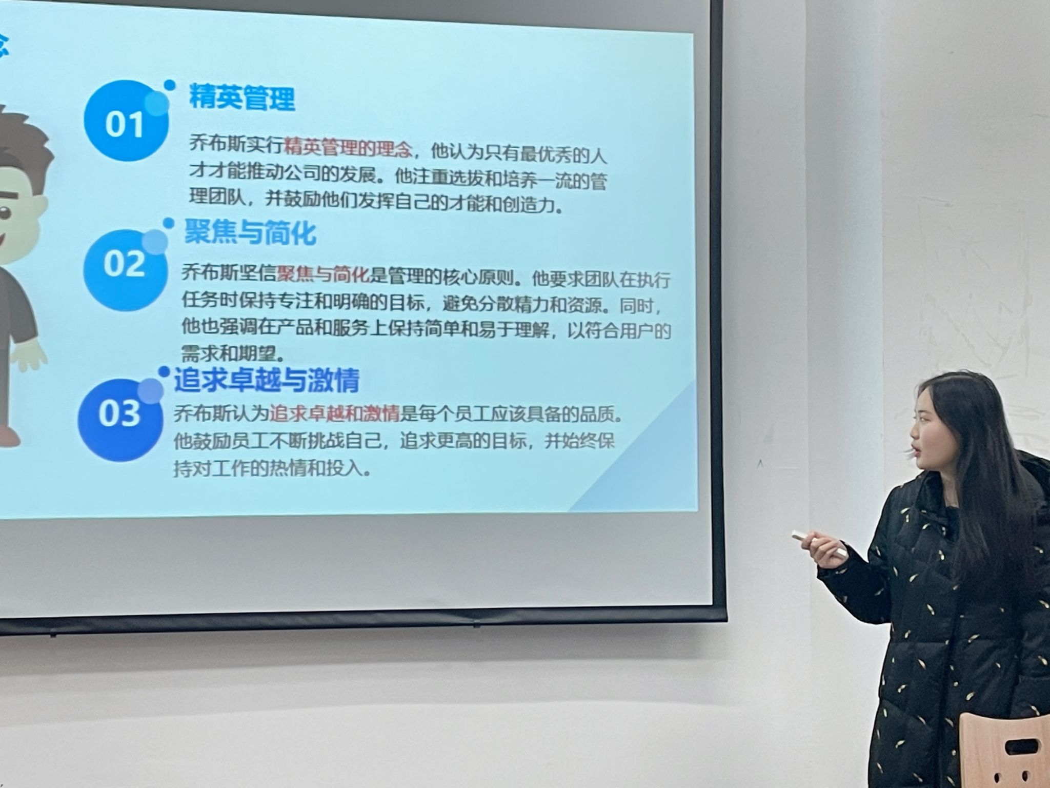 来自2023级财务管理(专升本)1班的刘思杰、范磊、王莹淞三位同学分别从乔布斯的工作态度和工作理念、创新精神、完美主义谈论了乔布斯。他们坦言:“他的故事既具有启发,又有警示,充满了关于创新、个性、领导力以及价值观的教益。”