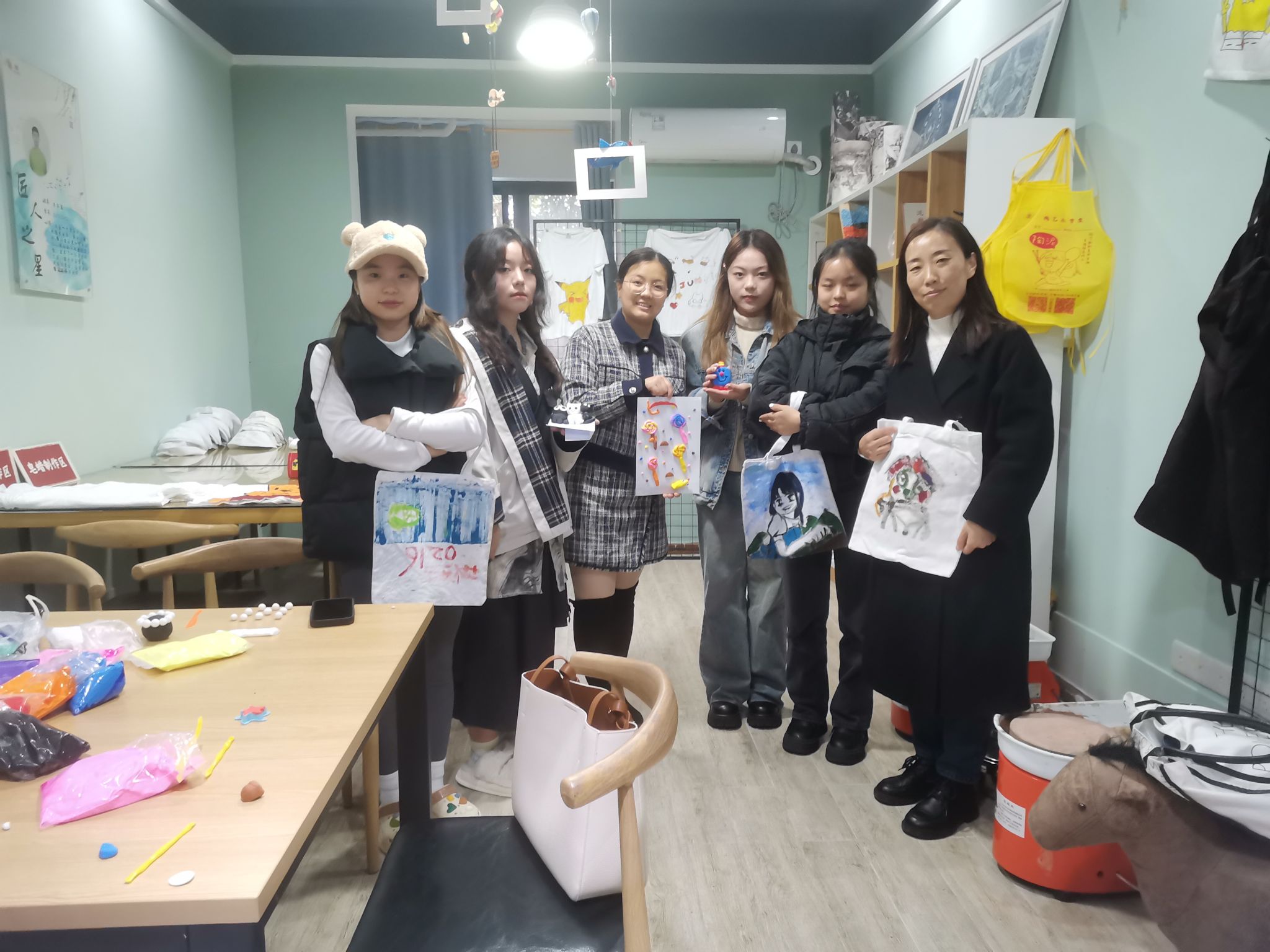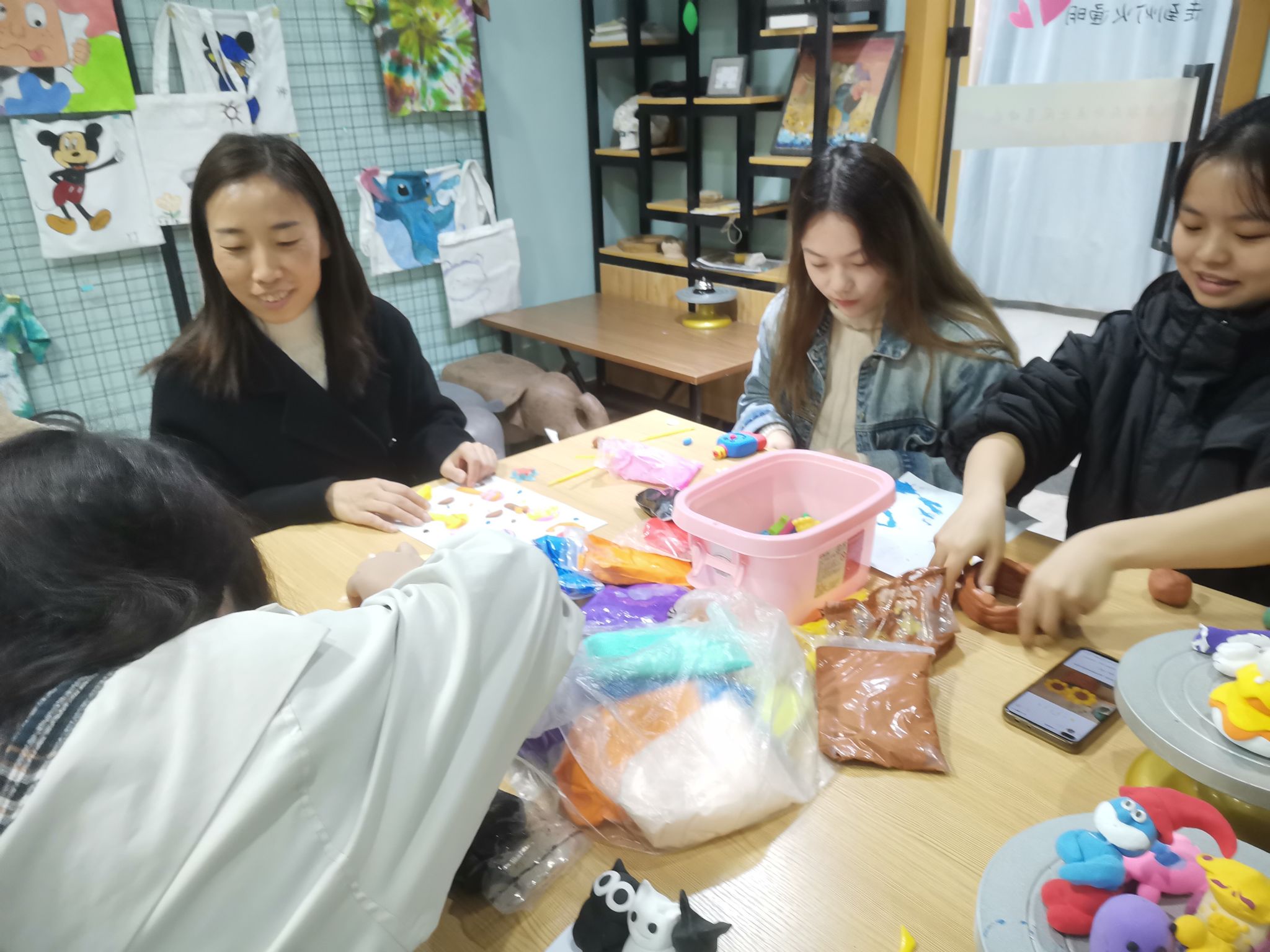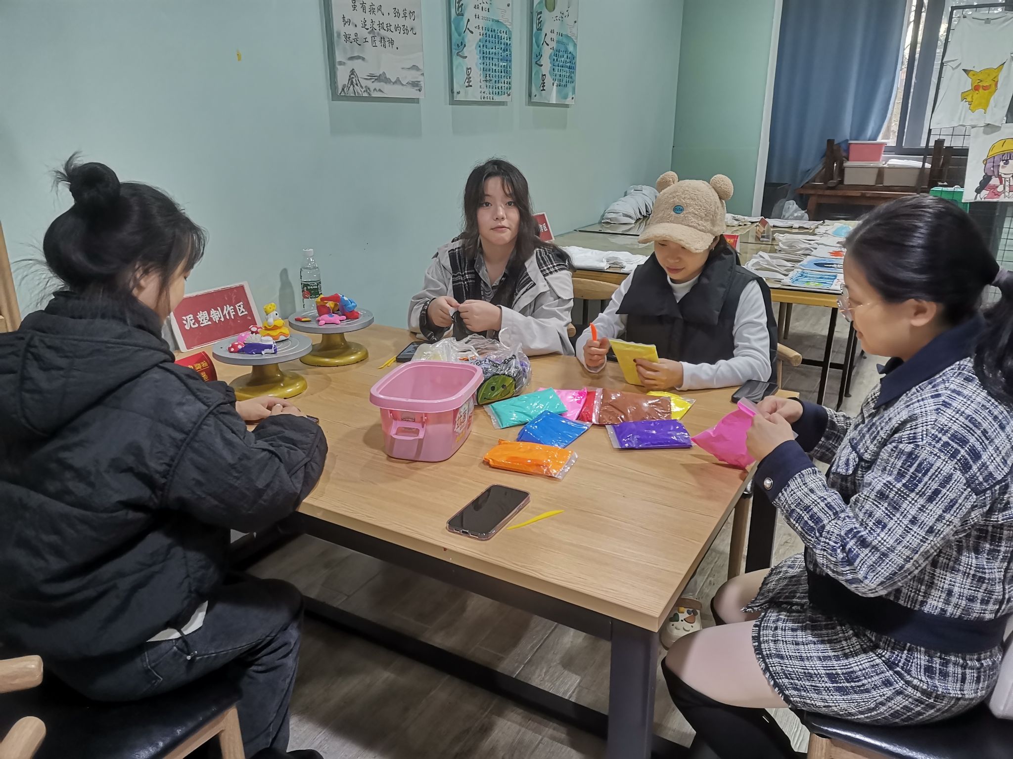 活动现场学生们玩的非常开心,大家一边聊着大学生活的趣事,一边制作手工泥塑。同学们做了黑猫、白猫,也有制作小绵羊的,有的同学制作了向日葵等等。徐老师和周老师也给同学们提供一些大学生活的小建议,让同学们能尽快地适应本科生活,并且更快的确定自己今后的学习目标。