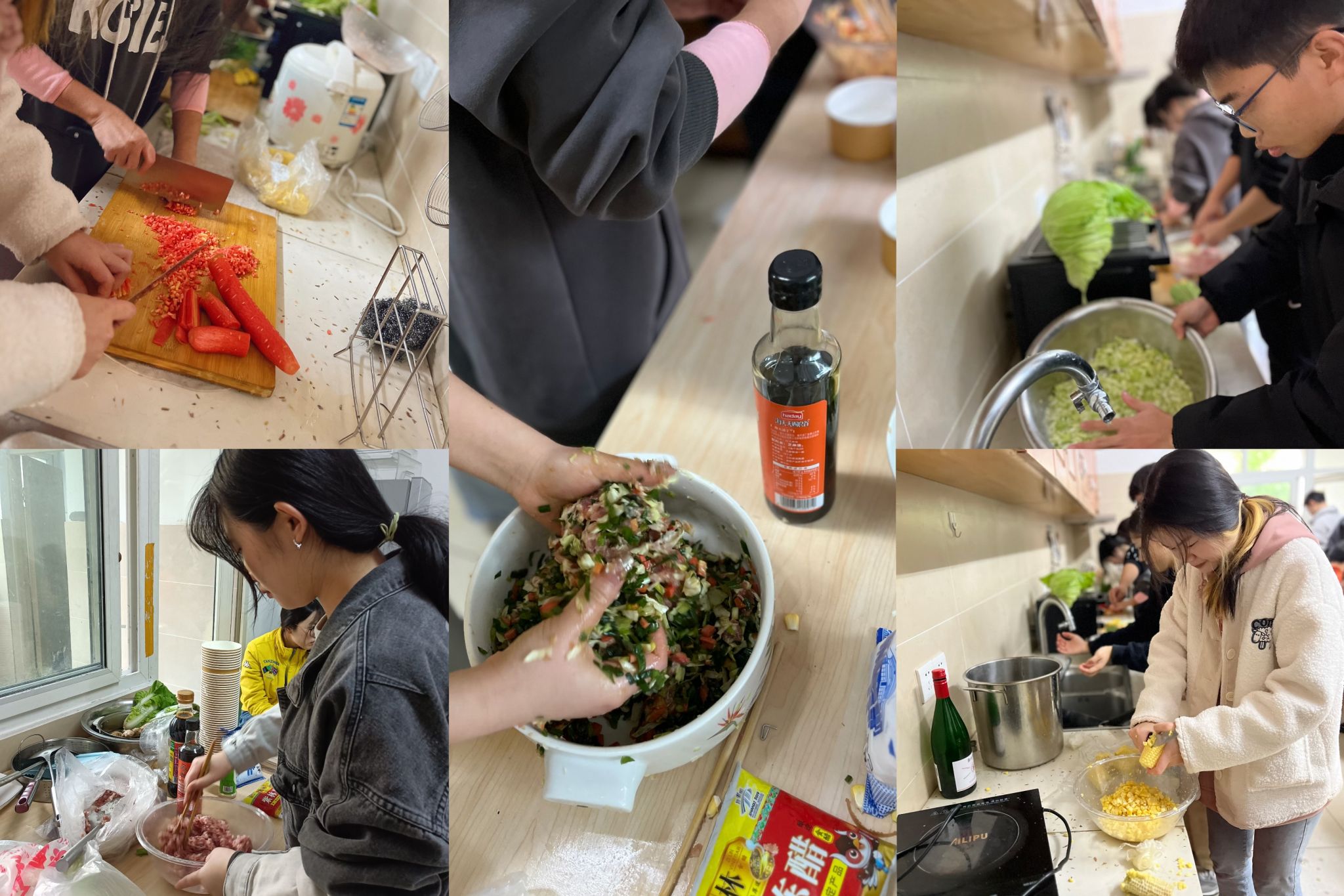 活动现场,三位老师为同学们准备了饺子皮、饺子馅食材以及各种调料。在正式包饺子前的准备工作中,同学们分工协作、井然有序,有的洗盆子、有的铺桌子、有的剁现、和馅,忙得不亦乐乎。