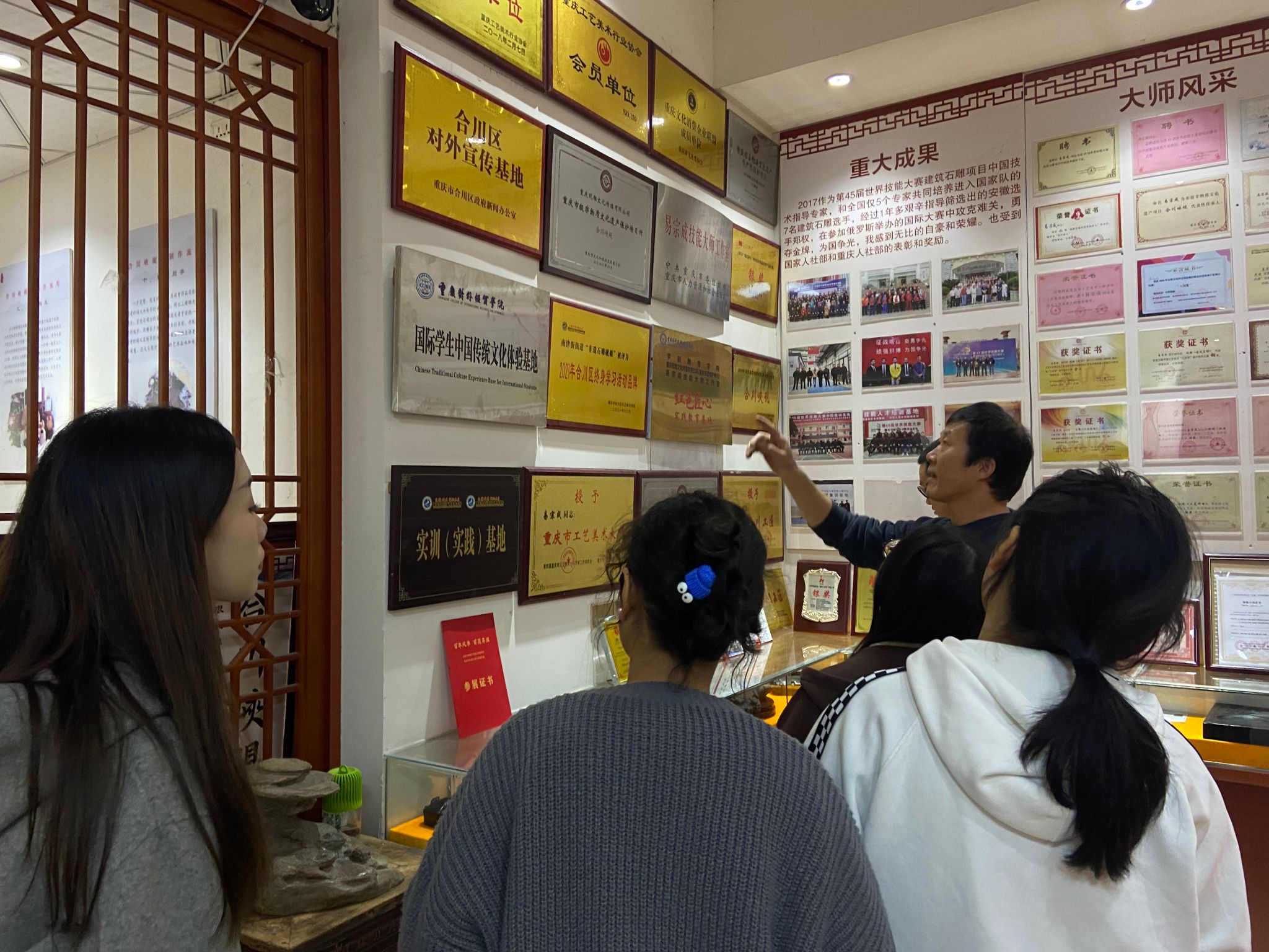 为了丰富学生的非遗体验及感受,深化产教融合。11月22日下午13:30时,异科导师李凤勤老师带领异科小组成员、工坊小组成员来到合川文峰古街开展“寻迹合川—参观峡砚博物馆”系列活动,并邀请峡砚博物馆馆长、合川峡砚代表性传承人易宗成老师为同学们讲解交流合川砚文化。