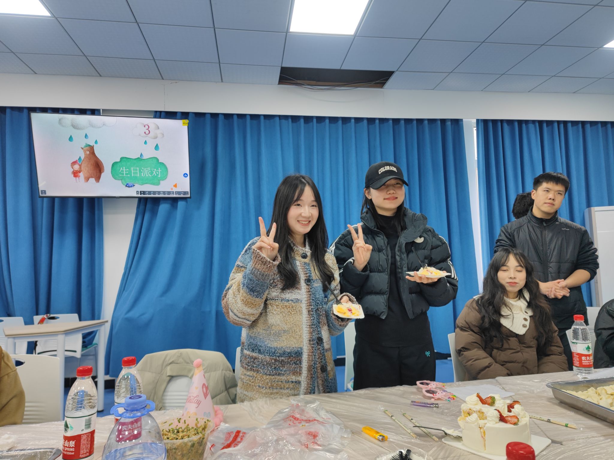 除了制作美味的饺子,这次活动还为两位生日的同学带来了小小的惊喜。班级为两位寿星同学张燚和陈雪瑶准备了精致的生日蛋糕并欢唱生日歌送上了最真挚的祝福。税老师和韩老师也代表班级为两位同学送上了生日小礼物。生日蛋糕的点燃和温馨的歌声,将整个教室的气氛推向了高潮,每一个人的笑容都洋溢着幸福与喜悦。在包饺子的过程中,同学们还参与了两个趣味游戏,活跃了气氛,增添了欢乐。这些游戏不仅锻炼了同学们的团队合作能力,更增强了大家的互动和友谊。活动期间,韩舒臣老师和税青老师也不忘关心同学们的学习和生活情况。他们的关怀让同学们感受到了温暖和关爱,也激励着大家更加努力学习,踏实自己的学业、追求自己的梦想。