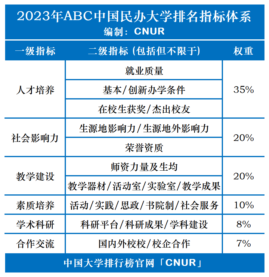 本次ABC中国民办大学排名首次对除职业本科、本科招生数少于500人外所有民办高校进行评价,并基于中国民办大学评级结果,以评级为基础进行分类分段二次量化分析。主要分为人才培养、社会影响力、教学建设、素质培养、学术科研和合作交流六大板块,内设20余项二级指标,细分近百项具体指标。