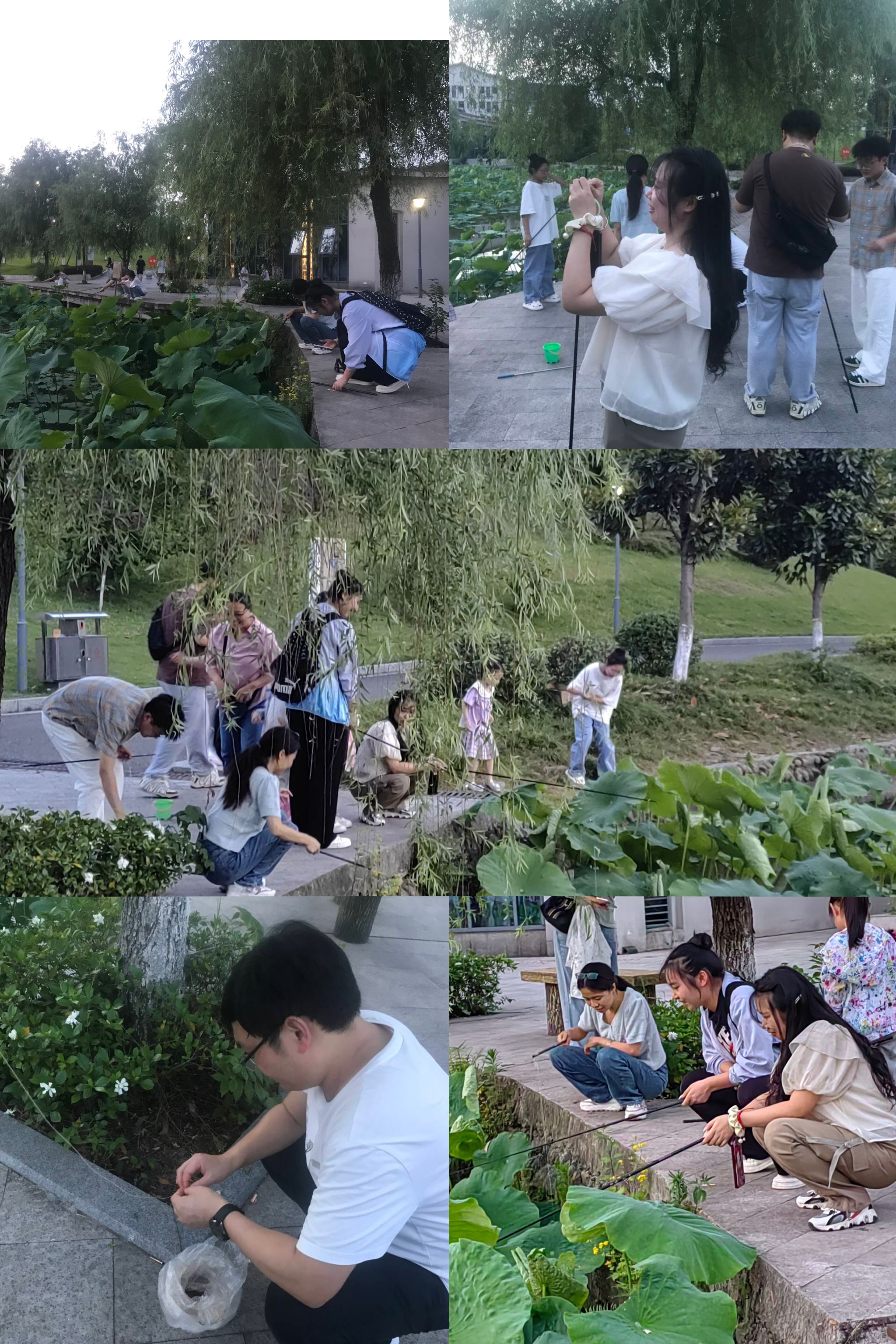 清风明月柳丝轻,一池春色万蛙鸣!交流后,师生们一起转移至北校区荷塘,取出提前准备的钓具、钓饵,开始进行小龙虾垂钓,共享学术讨论后的休闲欢乐时光!经过一个多小时的垂钓,欢心雀跃伴随着一声又一声的惊呼,大家都收获颇丰,纷纷展示自己的垂钓成果。