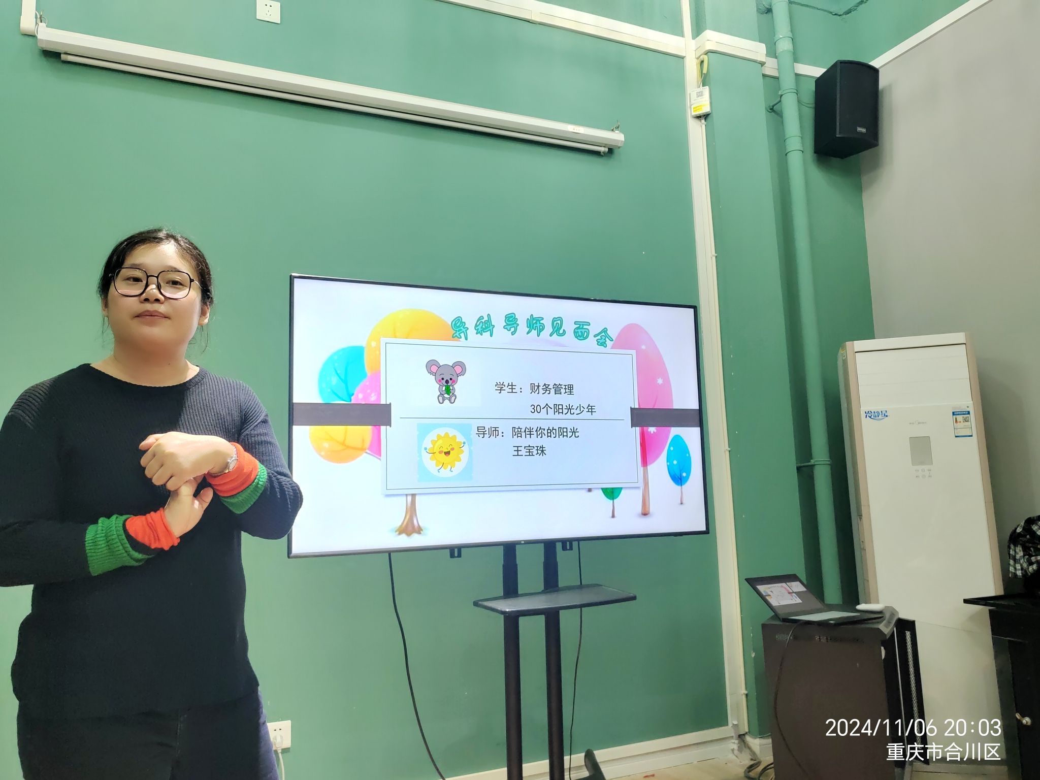 交流会上王老师为同学分别建立了不同的成长档案,并且为学生制定了“一对一对谈、一人一档”计划,该计划实时跟进,直至毕业。同时王老师精心准备了一些礼品和奖励,每位学生根据自己不同的特点得到了不同的奖励,学生们都很开心,瞬间拉近了师生关系。王老师还精心准备了小零食庆祝与学生的相识、陪伴与成长,王老师还为同学们后期的社会实践活动进行了讲解。