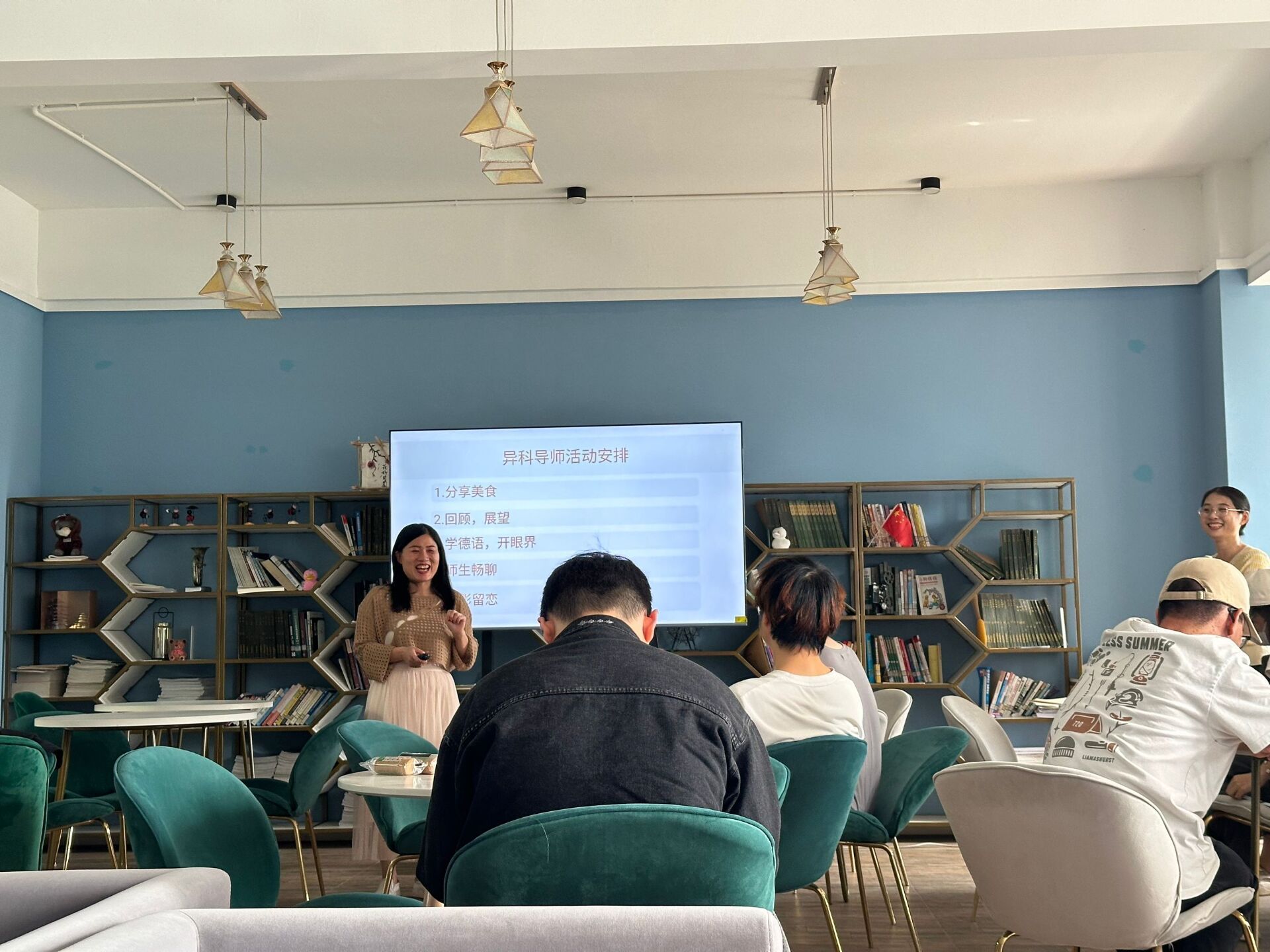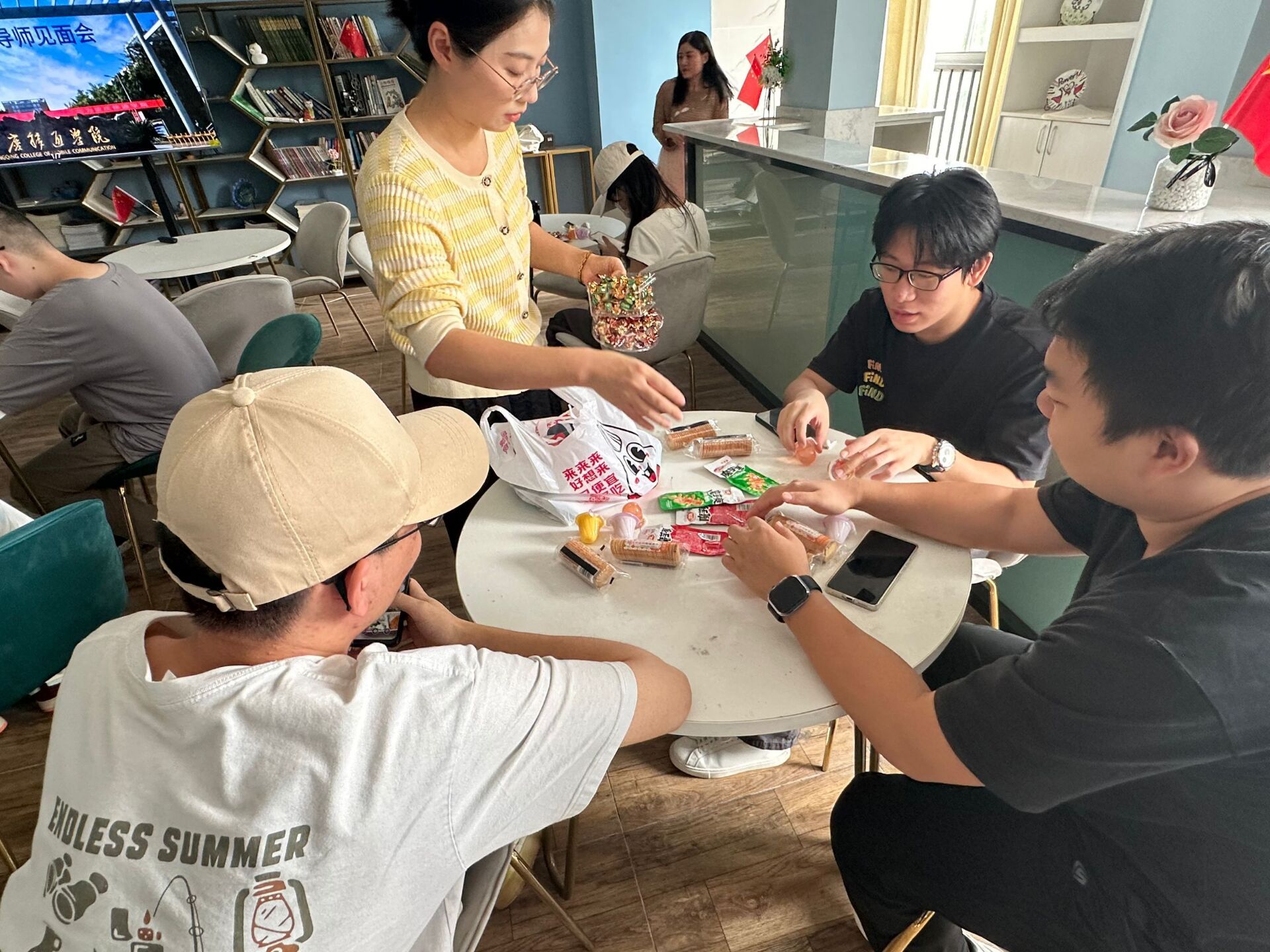 新学期,新气象,今年同学们迈入大四,为了扎实推进全生异科导师工作,帮助学生做好实习实践工作,规划大四生活和学习,为进入职场做好准备,刘菊、李梦雅异科导师小组于2024年10月16日相聚汇江书院“咖啡厅”开展“大四,开启新的旅途”师生见面交流会。见面会由微信扫码签到领零食、回顾过去展望未来、学德语开眼界、师生畅聊助力实习实践4个部分构成,见面会气氛轻松愉快,增进了师生情感,为助力学生在大四季向上成长,做好实习实践工作奠定了很好的基础。