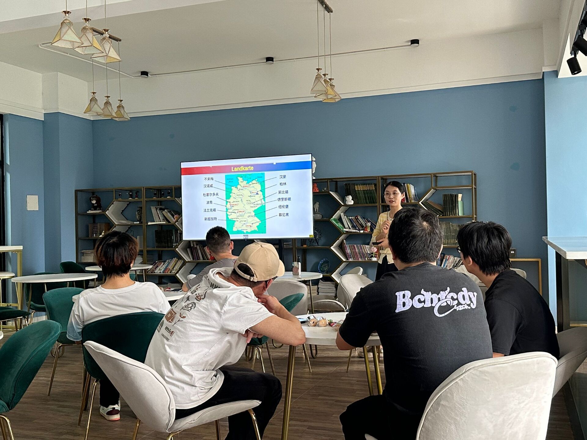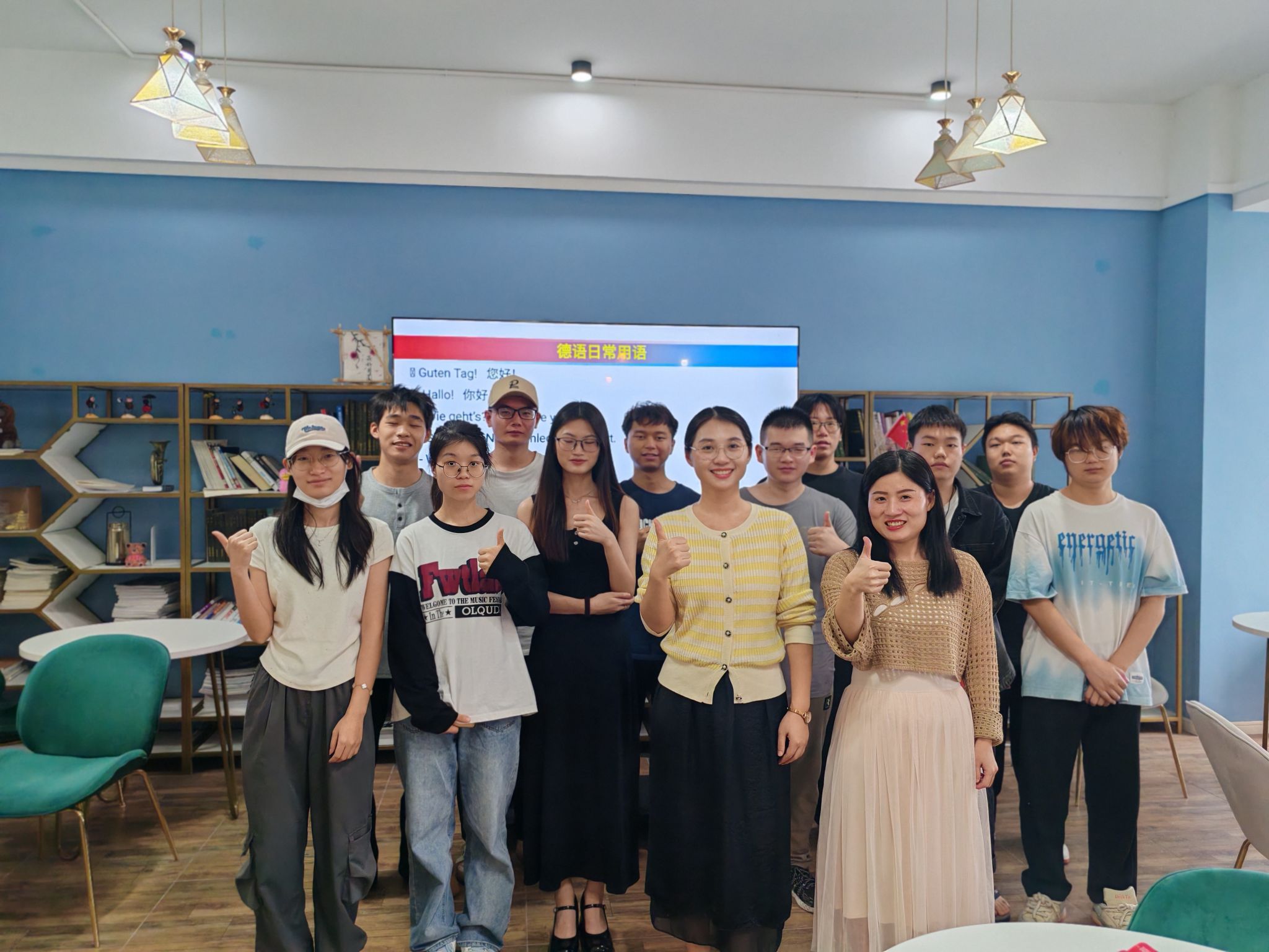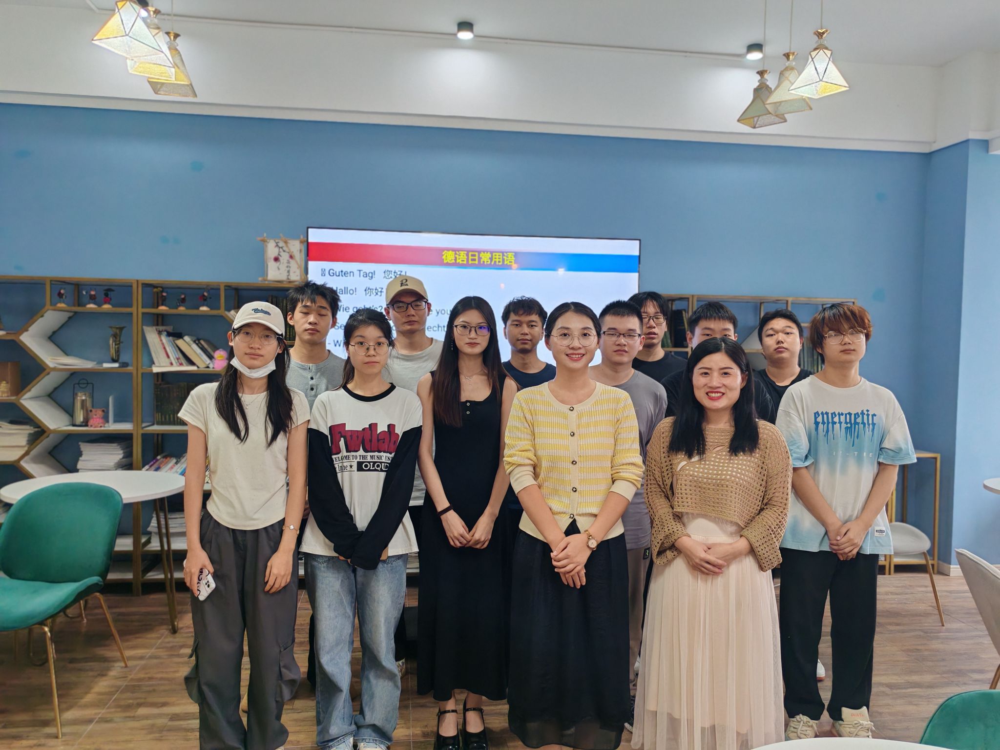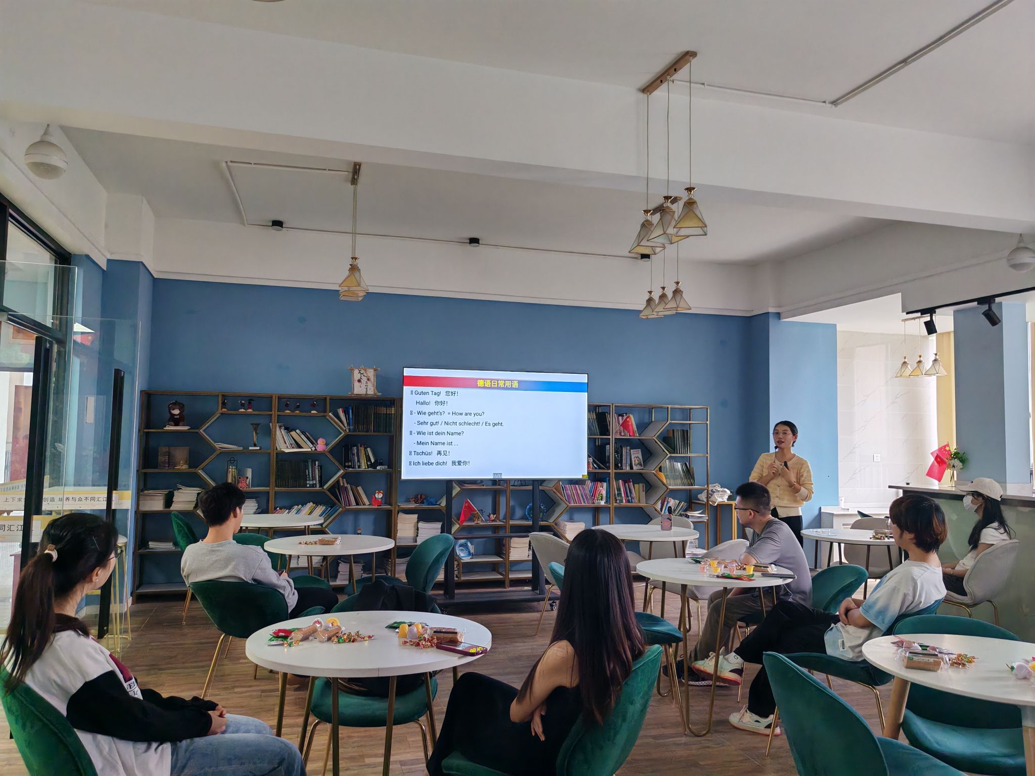 接着李梦雅老师和大家分享了学德语开眼界活动。李老师向同学们介绍了德国的地理位置、著名城市以及特色美食,讲解了德语在全球的使用情况、德语和英语的渊源、德语的特点等,另外还教了同学们一些简单日常的德语表达,以此开拓了学生们的国际视野,同学们在学习中表现得兴致勃勃。在师生畅聊助力实习实践过程中,同学们主动发言,提出了一些困惑、思考,刘菊老师和李梦雅老师耐心地给出解答。