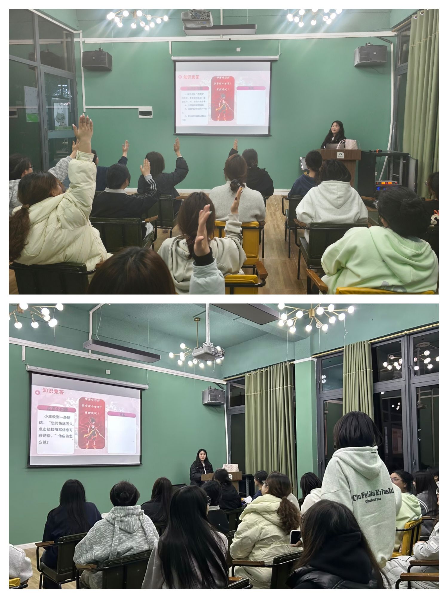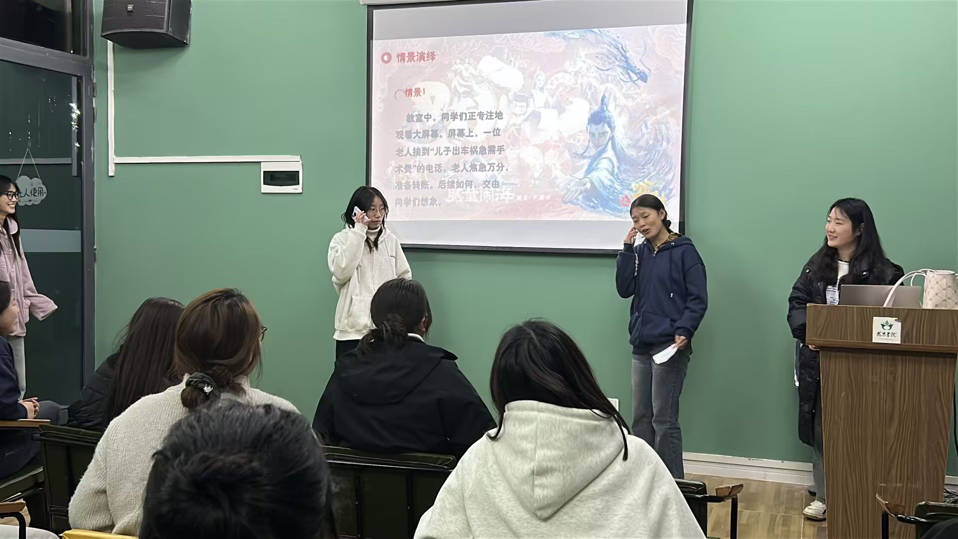 接下来情景演绎环节生动形象,同学们分组进行表演,将生活中常见的诈骗场景搬上舞台。在“冒充车祸诈骗”情景中,同学们发挥想象智斗诈骗犯,保住了老人的钱;在“刷单诈骗”情景中,新生小李面对“轻松刷单,日赚千元”的诱惑,差点上当受骗,幸好室友及时劝阻;在“冒充‘公检法’诈骗”情景中,张阿姨在女儿的提醒下,识破了骗子的诡计。在这些生动的演绎下,让同学们仿佛置身于真实的诈骗场景中,更加深入地了解了诈骗分子的话术和手段,学会了如何在关键时刻保持冷静,辨别真伪。
