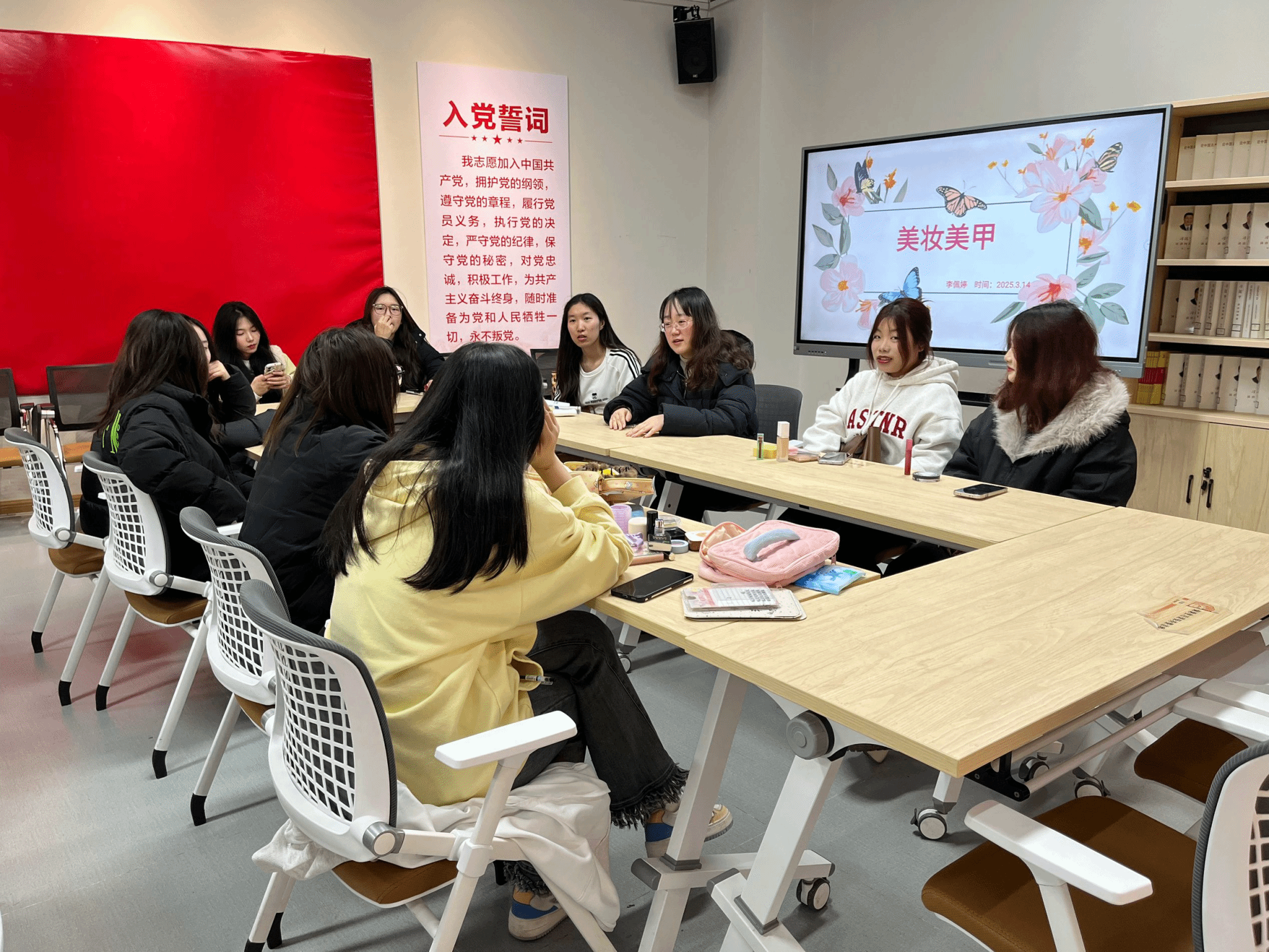 3月14日下午,一场别开生面的美妆实践课再南湖书院党团活动室拉开帷幕,十几名同学化身“美学探索者”,大家带上私藏的美妆爱用好物,通过沉浸式互动,创意碰撞和互助实践,共同演绎了一场兼具实践性与艺术性的青春美学课。