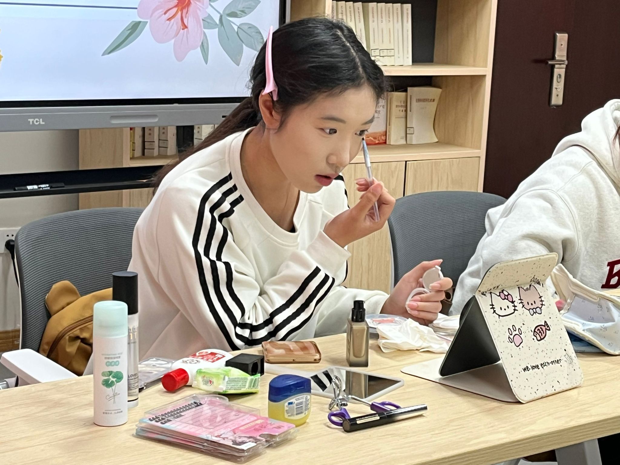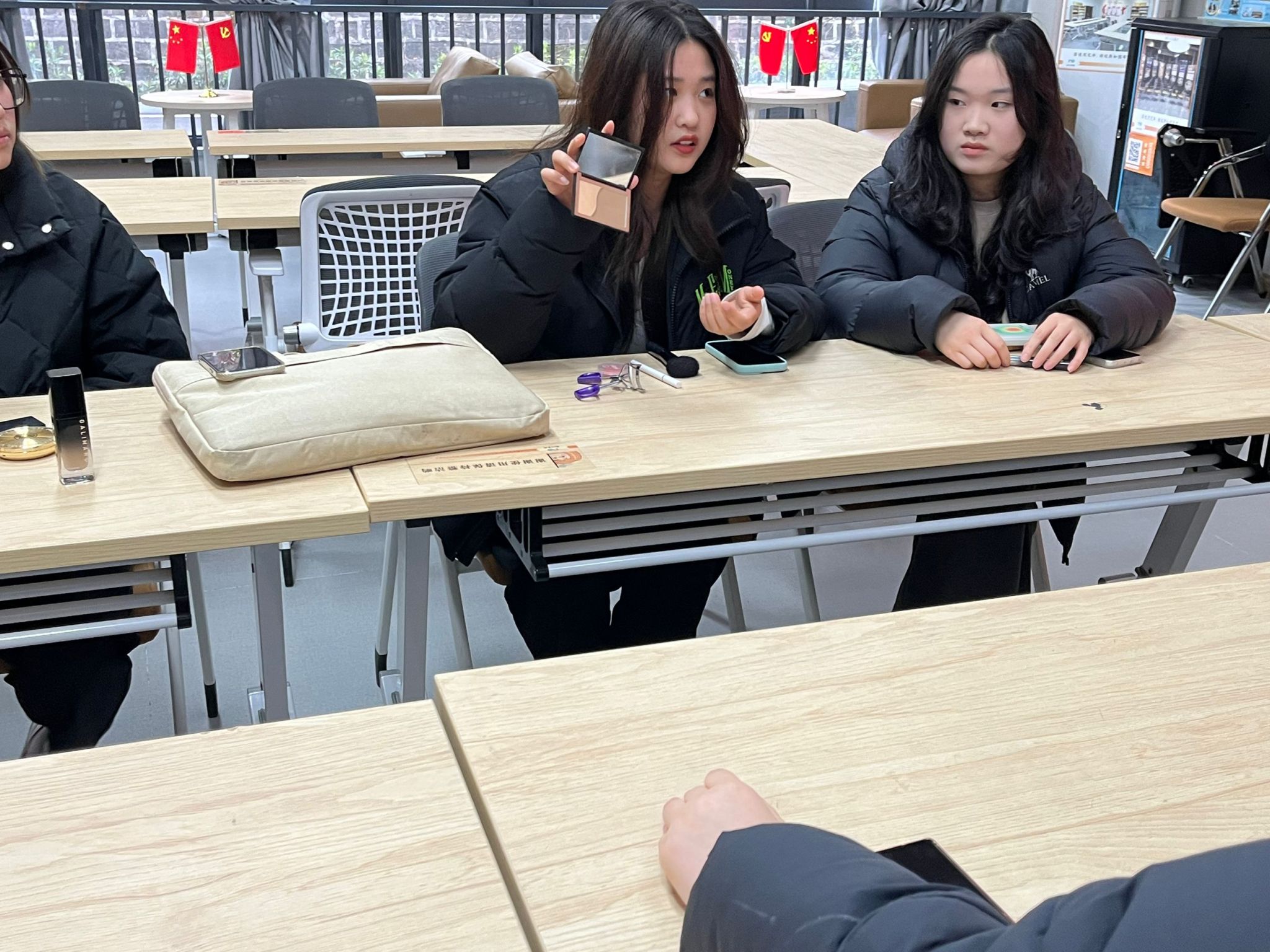 活动开始,琳琅满目的美妆产品铺满了整个桌子大家依次开始分享,第一位同学带来了她的爱用气垫,为大家展示了这个气垫的持妆性,后面的同学分享了修容盘,唇釉,粉底液等她们的爱用好物,不少同学纷纷种草。