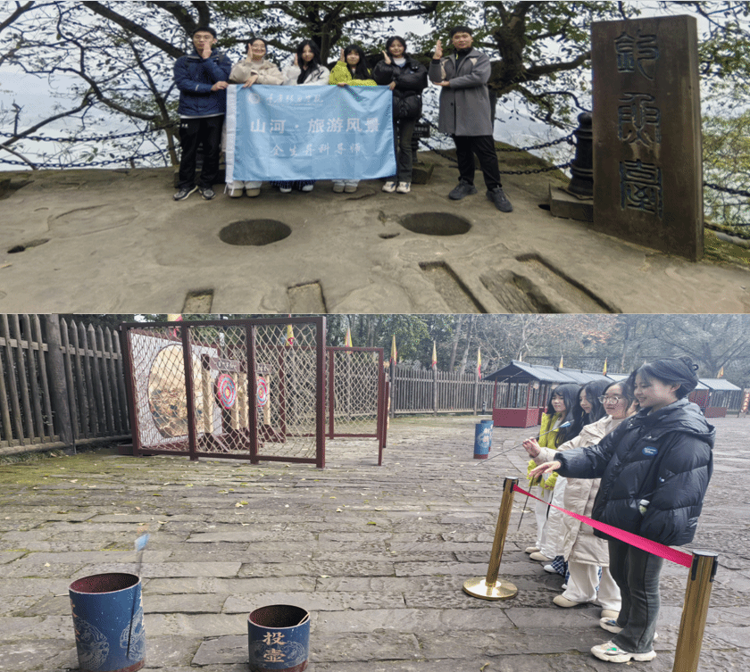 历经艰辛终于登上山顶,首先映入眼帘的便是钓鱼台。同学们怀着强烈的好奇心,仔细端详着那些古老的坑洞,听闻这竟是古人用来加工粮食的遗迹时,不禁对古人的智慧和创造力发出由衷的赞叹。当行至古校场,看到投壶器具,大家顿时被其吸引,纷纷跃跃欲试,尽情体验这一古老游戏所带来的独特乐趣,在欢声笑语中感受着历史文化的独特魅力。