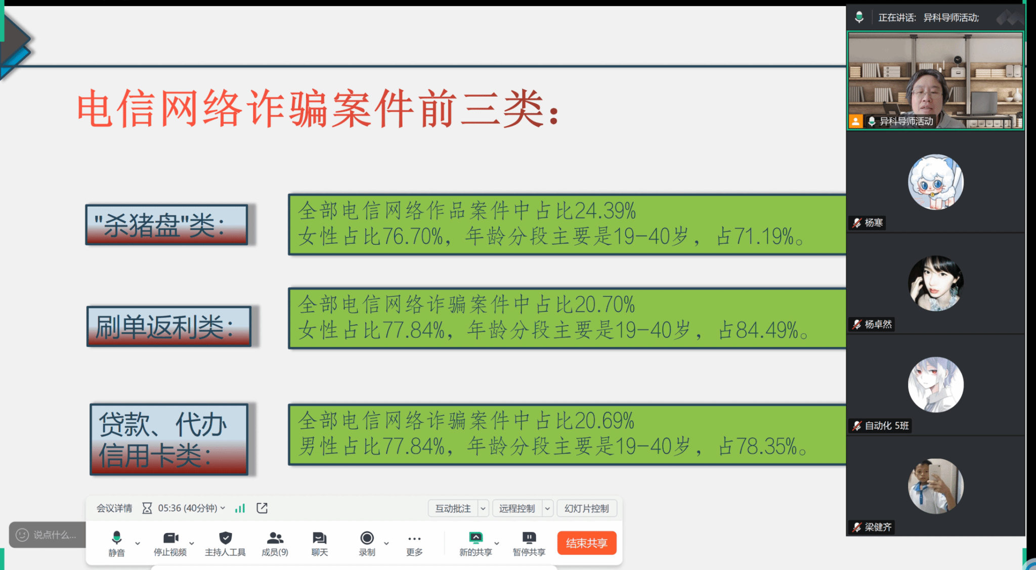 活动伊始,李乐艳老师以近期校园内频发的电信诈骗案件为切入点,阐述了开展反诈宣传的紧迫性和必要性。她指出:“当前电信诈骗手段不断翻新,学生群体因社会经验不足,极易成为犯罪分子的目标。本次线上活动不仅是一次知识普及,更是一堂关乎财产安全和心理健康的重要课程。”随后,李老师结合PPT中的统计数据,详细分析了电信网络诈骗的三大高发类型:婚恋交友诈骗(“杀猪盘”)、刷单返利诈骗及贷款代办信用卡诈骗。她通过真实案例,揭露了诈骗分子如何利用情感诱导、高利诱惑等话术实施犯罪,并强调“网络交友需谨慎,转账前务必三思”。