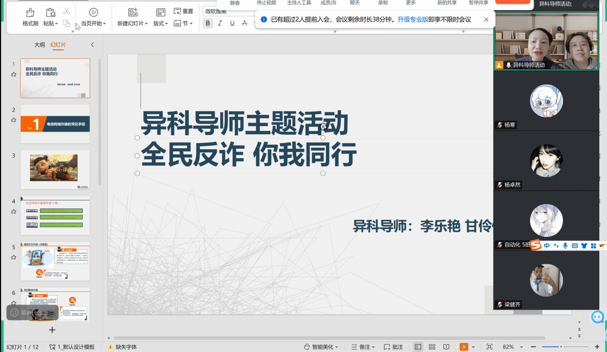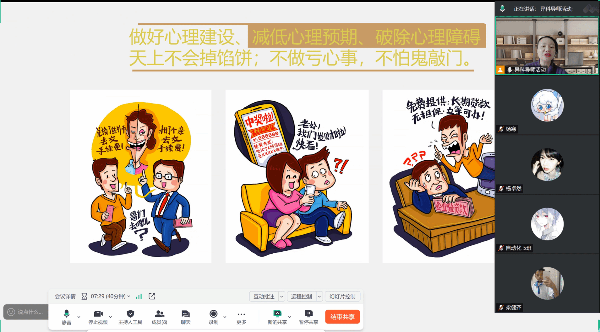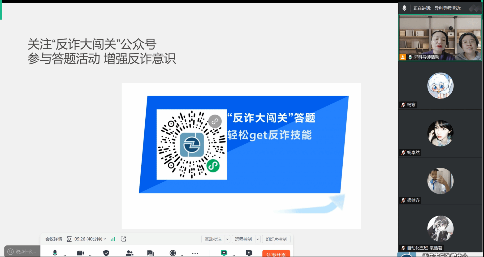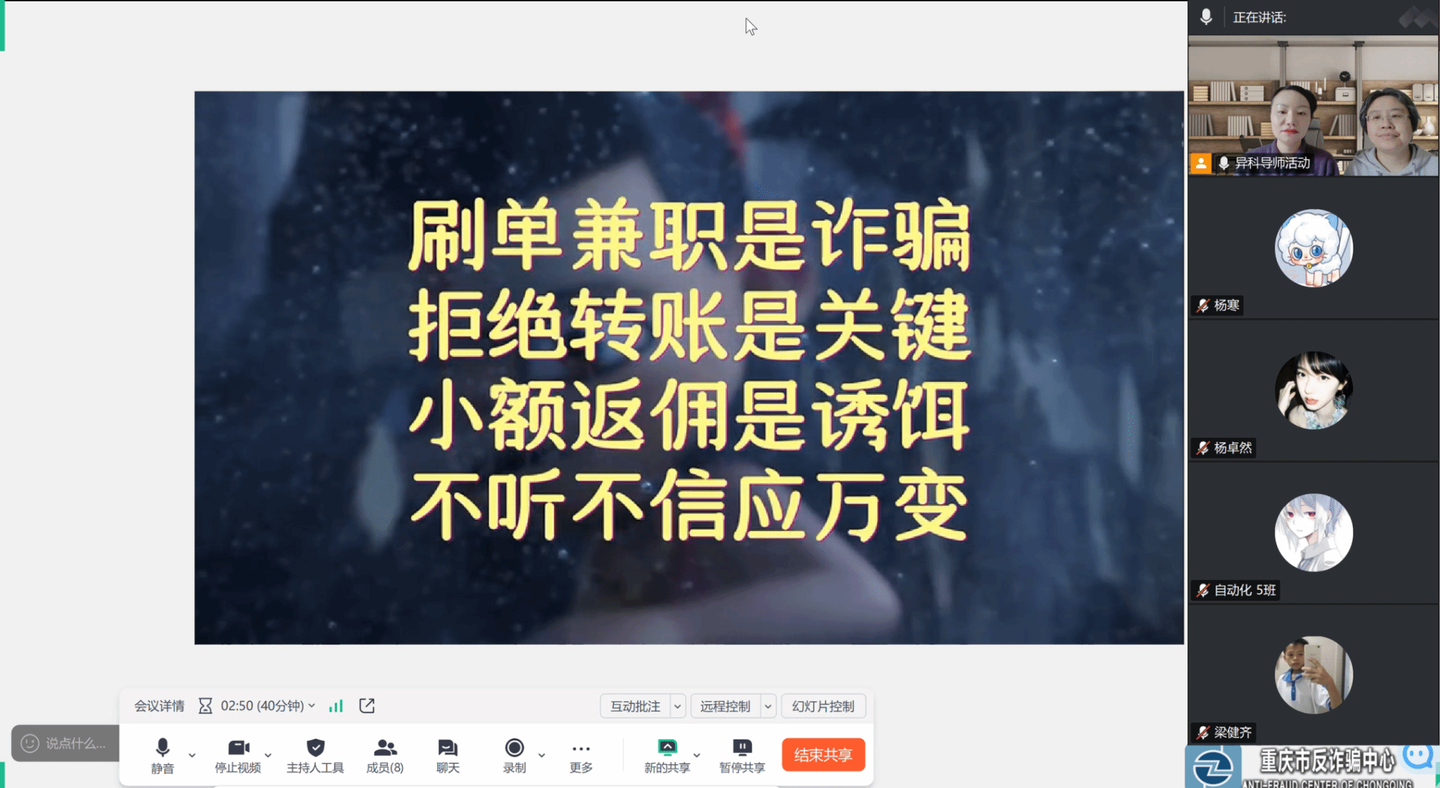 2025年4月10日,重庆移通学院淬炼商学院市场营销专升本17、18班与智能工程学院2024级自动化类4、5班的同学们通过腾讯会议齐聚云端,共同参与了一场主题为“全民反诈,你我同行”的在线反诈宣传活动。本次活动由淬炼商学院异科导师甘伶俐老师和智能工程学院导师李乐艳老师联合策划,旨在通过案例讲解、互动学习等形式,增强师生防范电信网络诈骗的意识和能力。