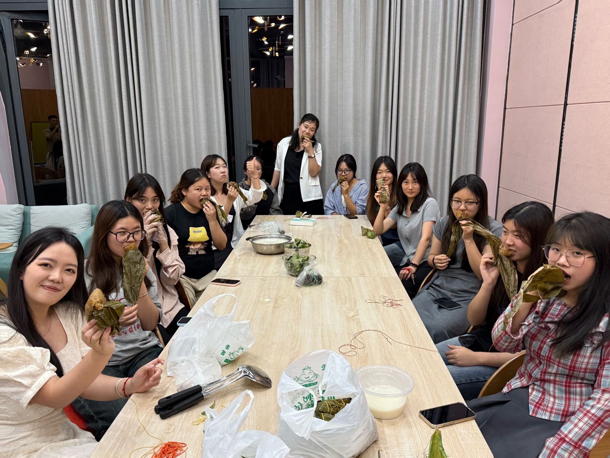 组织这次端午共聚活动,初衷是将文化传承、劳动实践与师生情谊自然融合。看到同学们从初学包粽子时的生涩笨拙,到逐渐熟练并创意频出(三角粽、四角粽、馒头粽各显神通),在粽叶清香与糯米甜香交织中,那份专注与快乐令人欣慰。活动期间穿梭于小组间,解答学业困惑,分享时间管理心得,探讨未来规划,分享恋爱经验,甚至轻松畅谈校园生活点滴,真正实现了亦师亦友的互动。粽香袅袅中,师生情感得以深化,文化认同悄然生根,共同成长的目标在温馨互动中得以实现,这正是异科导师工作的价值所在。