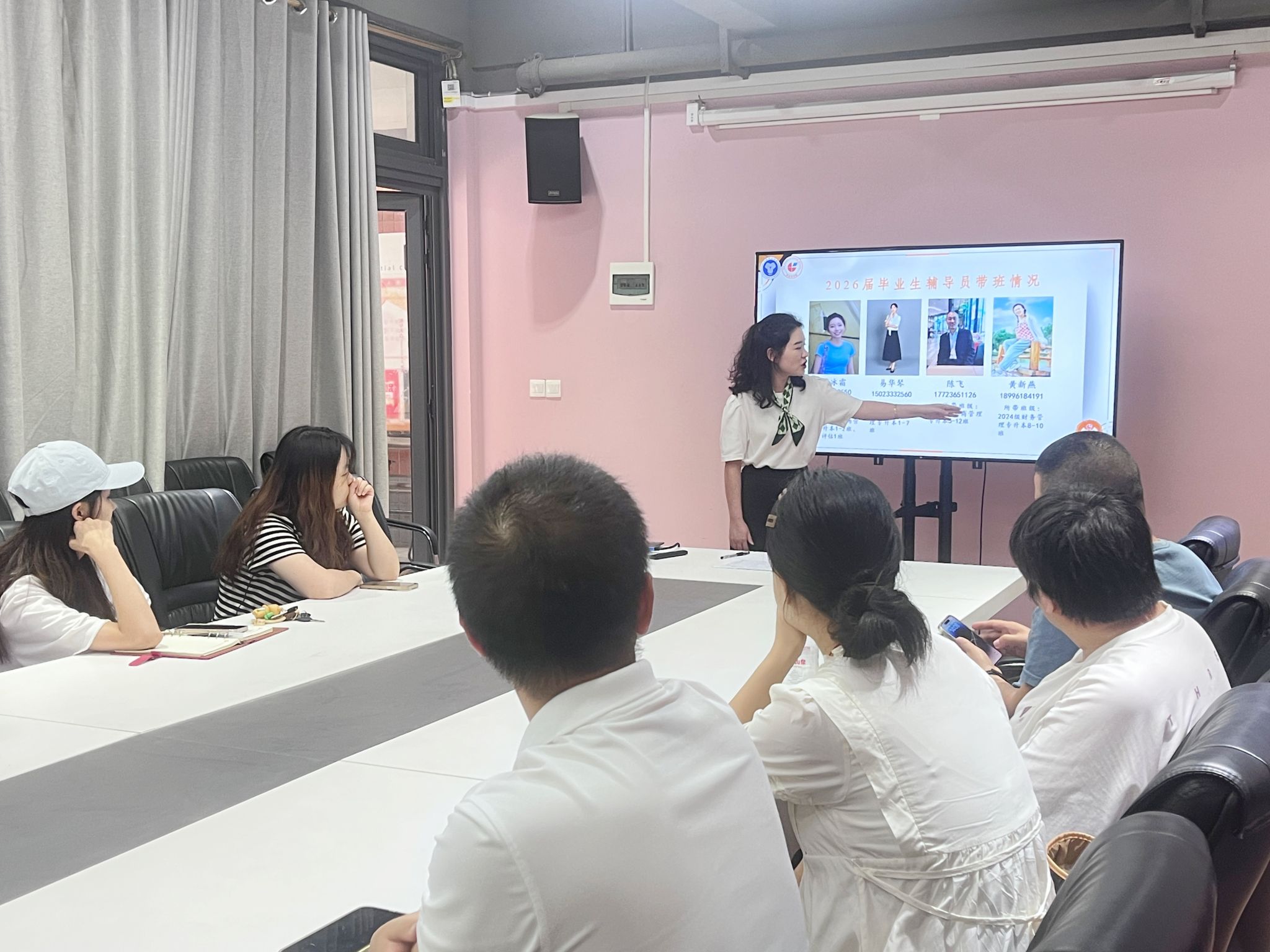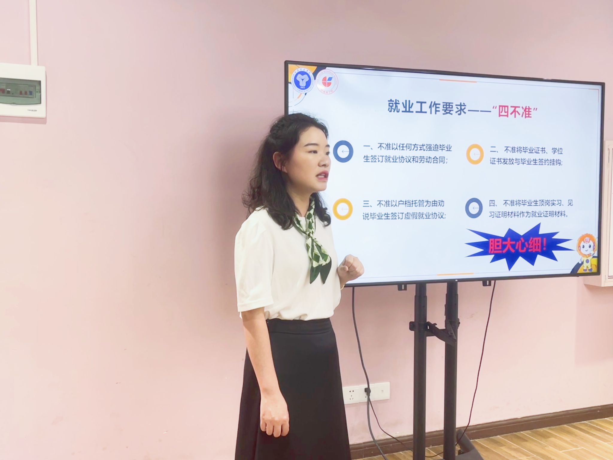会上,就业创业办公室主任杨伦芳老师系统介绍了淬炼商学院就业创业工作体系的核心理念与整体框架,阐述了学院致力于推动学生高质量充分就业的目标与机制。她概要性地介绍了2026届毕业生的总体情况及辅导员队伍的构成。杨主任还结合当前就业形势,深入解读了就业工作的基本概念、学院的具体要求以及必须严格遵守的政策规定,着重强调了就业工作的重要性、应遵循的基本原则和明确的纪律底线。