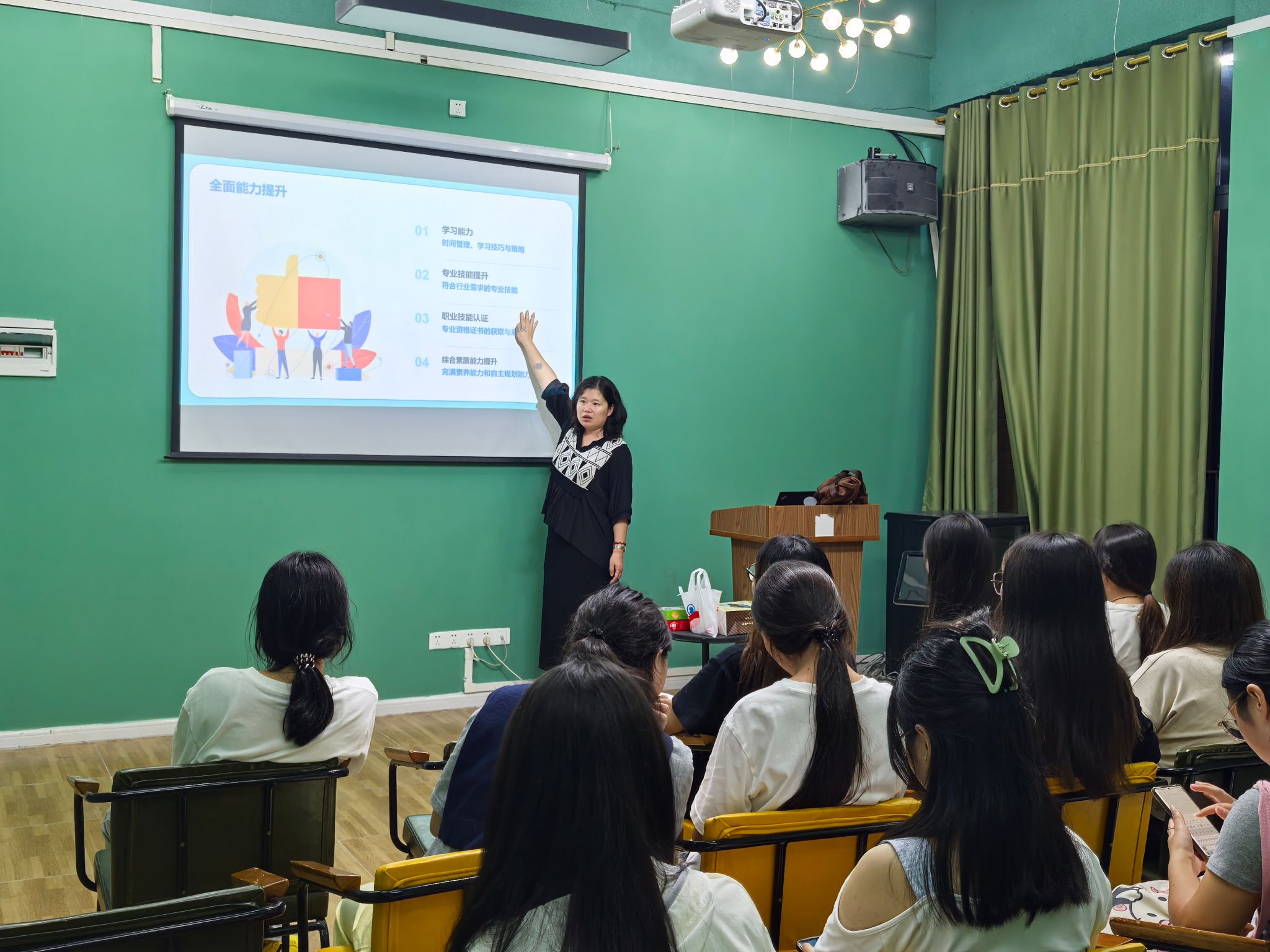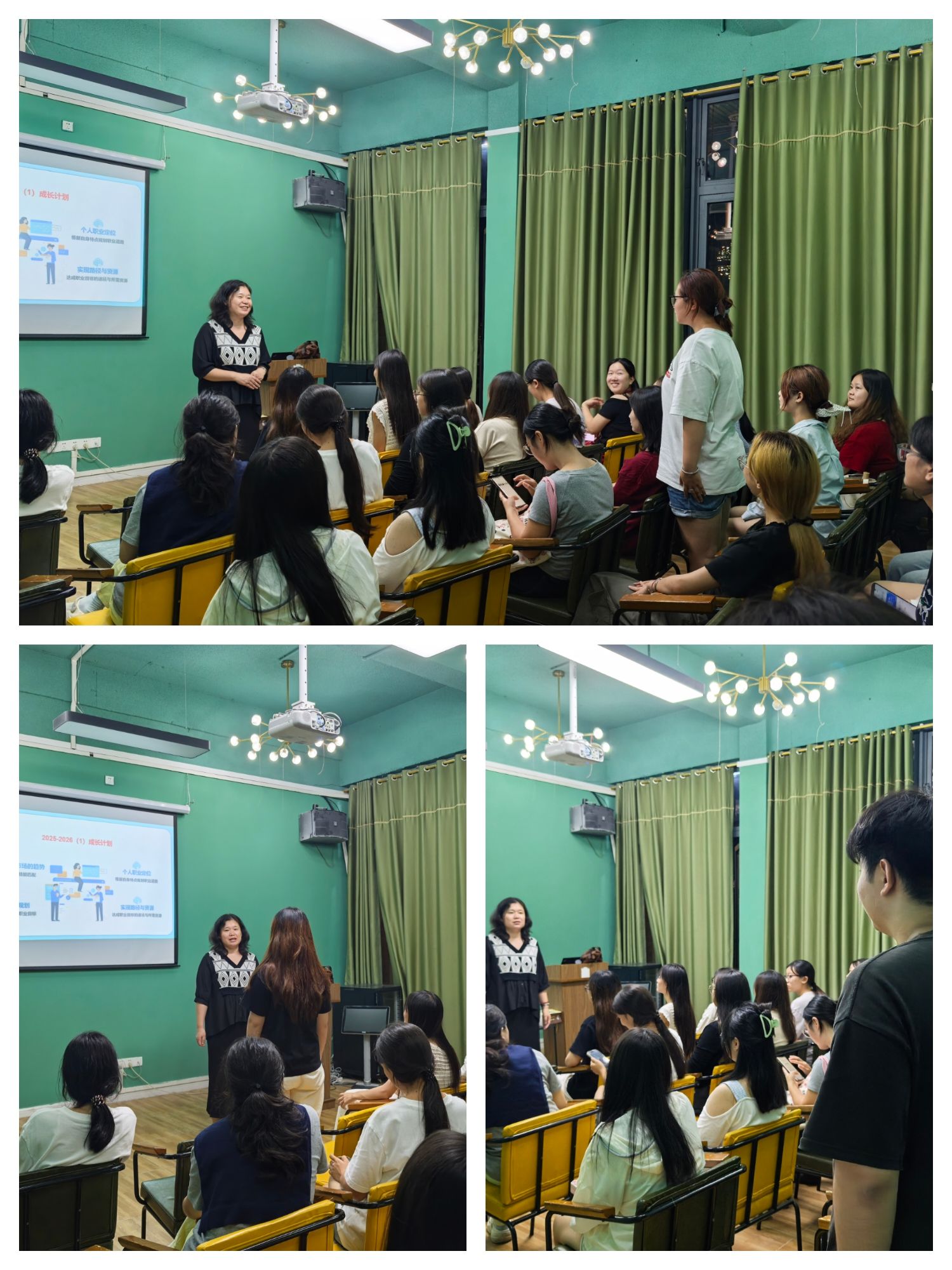 王宝珠老师以学校定位为切入点,结合 “高情商、懂管理的应用型人才” 培养目标,阐释 “四位一体 + 双院制” 人才培养模式,通过 “解读办学理念、全面能力提升、未来职业规划” 三大环节与学生互动,助其明确新学期目标。“全面能力提升” 环节,她从学习能力、专业技能、职业技能认证、综合素质能力四维度指导,如分享财务专业学习技巧、分析行业技能需求、解读证书重要性并鼓励考证、建议参与完满活动。“未来职业规划” 环节,她从就业趋势分析、目标设定、路径规划引导学生,展示财务专业就业分布与新兴职业前景,指导学生结合自身设定目标与规划路径。活动末,学生分享收获,杨旭同学称明晰方向与准备步骤,王老师鼓励学生定期复盘、及时沟通。