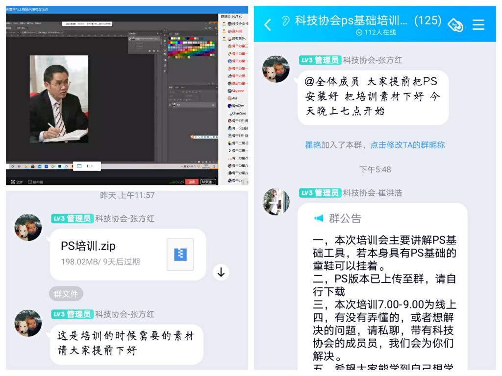 本次理论课程采用线上直播的方式,在提高大家学习积极性的同时,能够更加清楚直观的观看整个操作过程。由张方红学长讲解为辅,学员们练习为主,有问题及时在群里提出。张方红学长也为我院青马工程完骨初阶班的学员们一一介绍了PS软件中左侧的常用工具及其功能,随后让学员们进行了简单的热身操作。学员们不放过任何操作小细节,积极尝试,跟随学长的思路,及时完成课堂任务。张方红学长以制作海报为例,为大家详细的演示了制作海报的全过程,同时还分享了一些制作海报的小技巧。