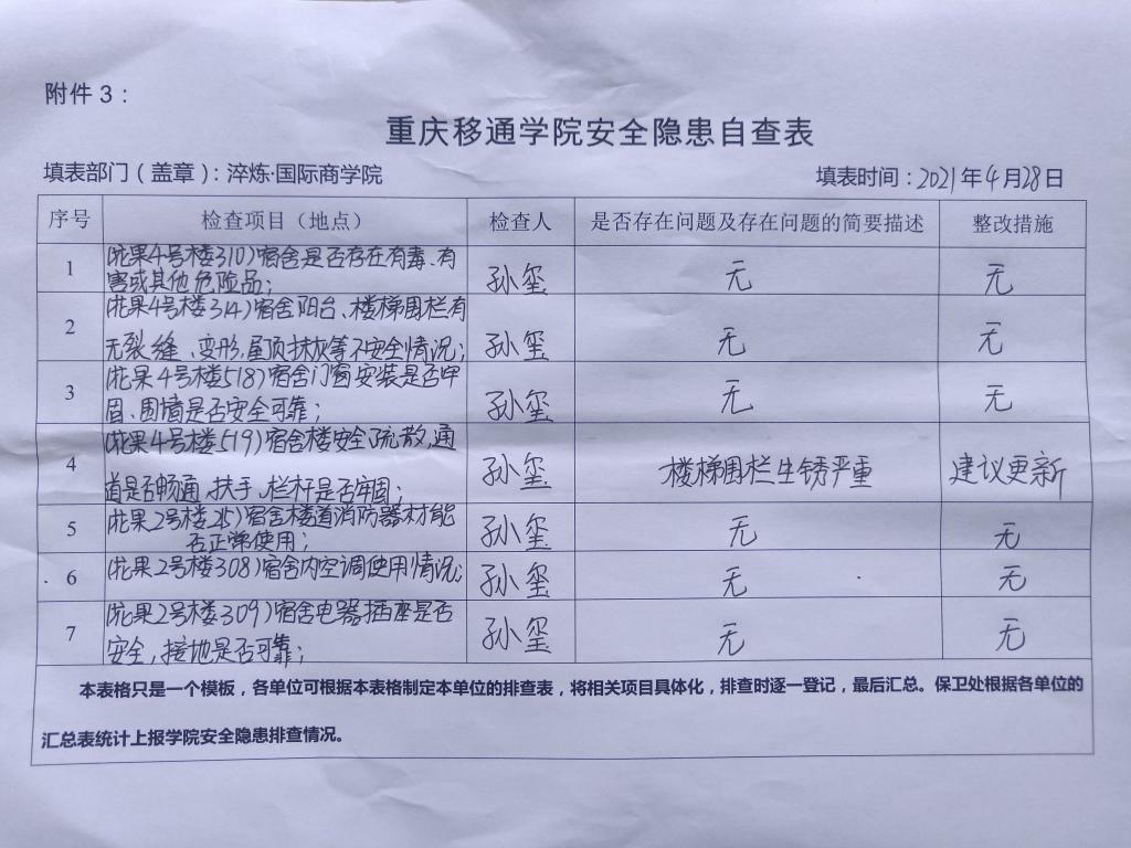 本次安全隐患检查工作结束后,第五网格领导孙玺教授提出要及时排查、反馈存在的安全隐患问题,并及时进行整改;要高度重视安全问题,为同学们提供一个安全舒适的生活空间;五一小长假将至,要做好节前安全教育工作,强化师生的安全防护意识。