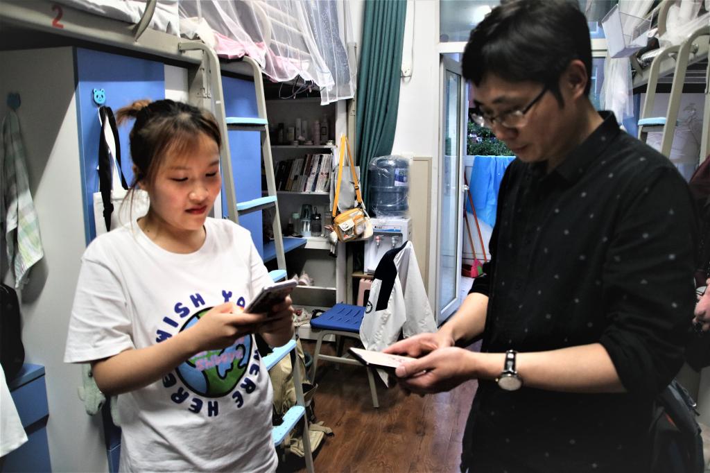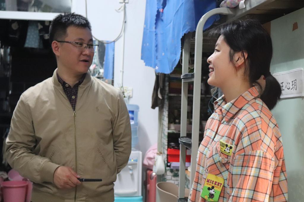 寝室的安全问题也是重中之重。宿舍的同学都很积极的探讨起使用违规电器带来的安全隐患,而孙玺教授也指出了同学们寝室还存在衣服挂钩支出,容易碰到同学头顶;床帘太过封闭,安全性得不到保障等问题,提醒同学们对于安全工作和意识形态领域的问题我们要积极应对,及时预防,早发现、早处置。