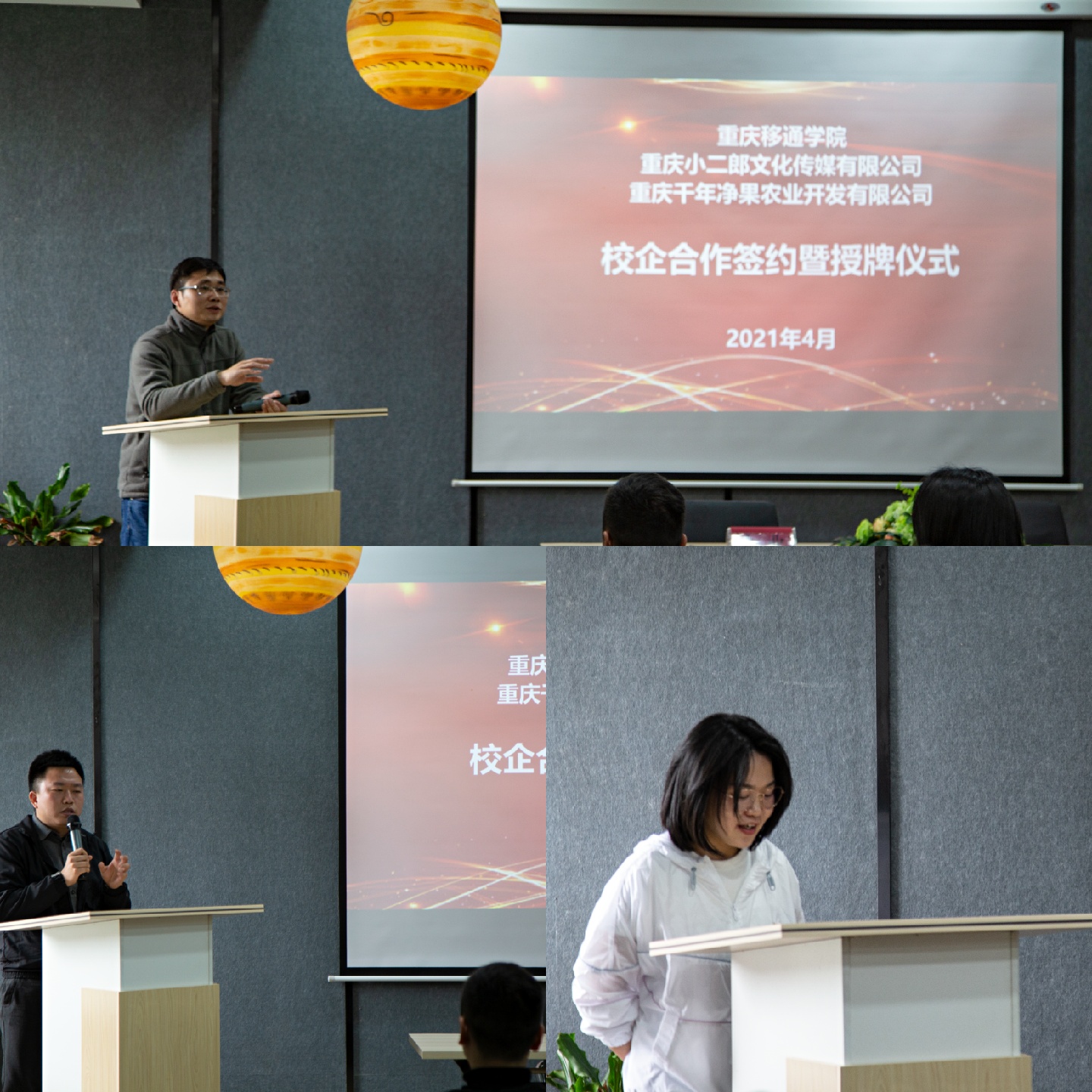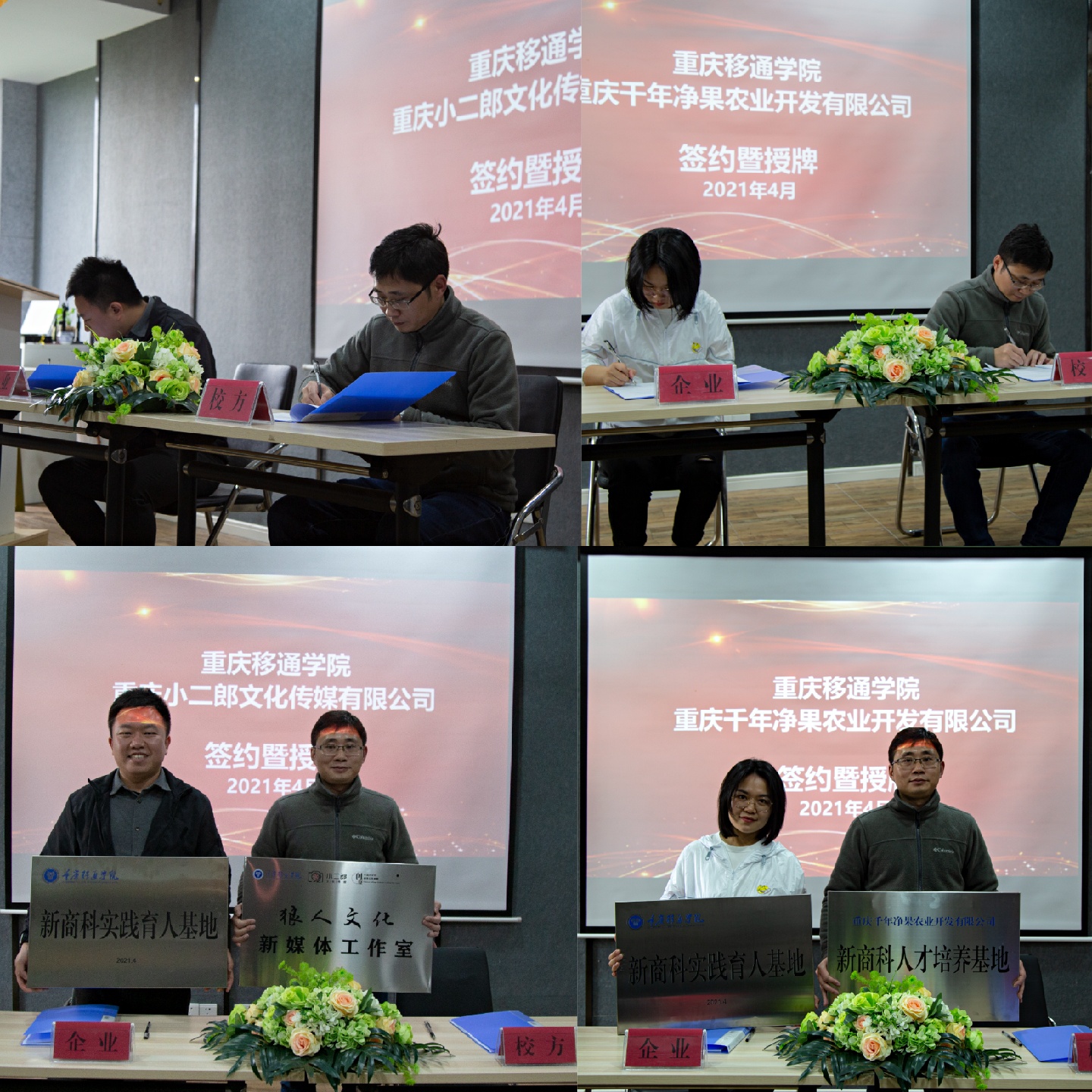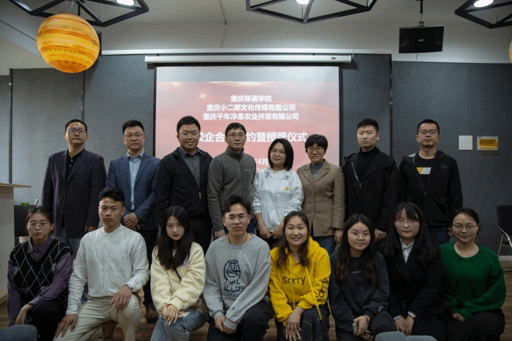 4月6日下午,在汇江书院影音活动室,隆重举行了重庆移通学院与重庆小二郎文化传媒有限公司(以下简称小二郎)、重庆千年净果农业开发有限公司(以下简称净果农业)的校企合作签约暨授牌仪式。校方授牌成立了狼人文化新媒体工作室、新商科实践育人基地,企业方授牌成立了新商科人才培养基地。出席此次仪式的有小二郎创始人兼CEO姜军、净果农业总经理刘洪颖等企业嘉宾,我校淬炼·国际商学院院长张平,副院长曾璐、梁少锋,学工办主任李伟光以及市场营销教研室全体教师和学生代表。