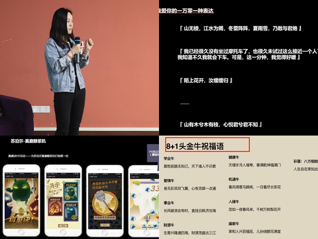 何瑞老师随即又引用了大量的广告文案创意来分析如何写好文案,比如沃尔沃汽车&大众点评、BYTON、adidas等,还利用了苏泊尔-真磨醇浆机以及牛年新年寻牛寻好运中H5页面互动逻辑中文案的成功来分析了其文案的奥妙之处,以打开同学们的思路。