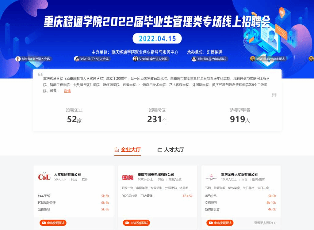 在疫情时代的背景下,就业形势日趋激烈,岗位竞争压力逐渐增大。为缓解同学们的就业压力,拓宽同学们的就业渠道,增加同学们的就业机会。由重庆移通学院就业创业指导与服务中心主办,淬炼·国际商学院承办的2022届毕业生管理类专场线上招聘会于2022年4月15日10:00-17:00在汇博招聘网顺利举办。