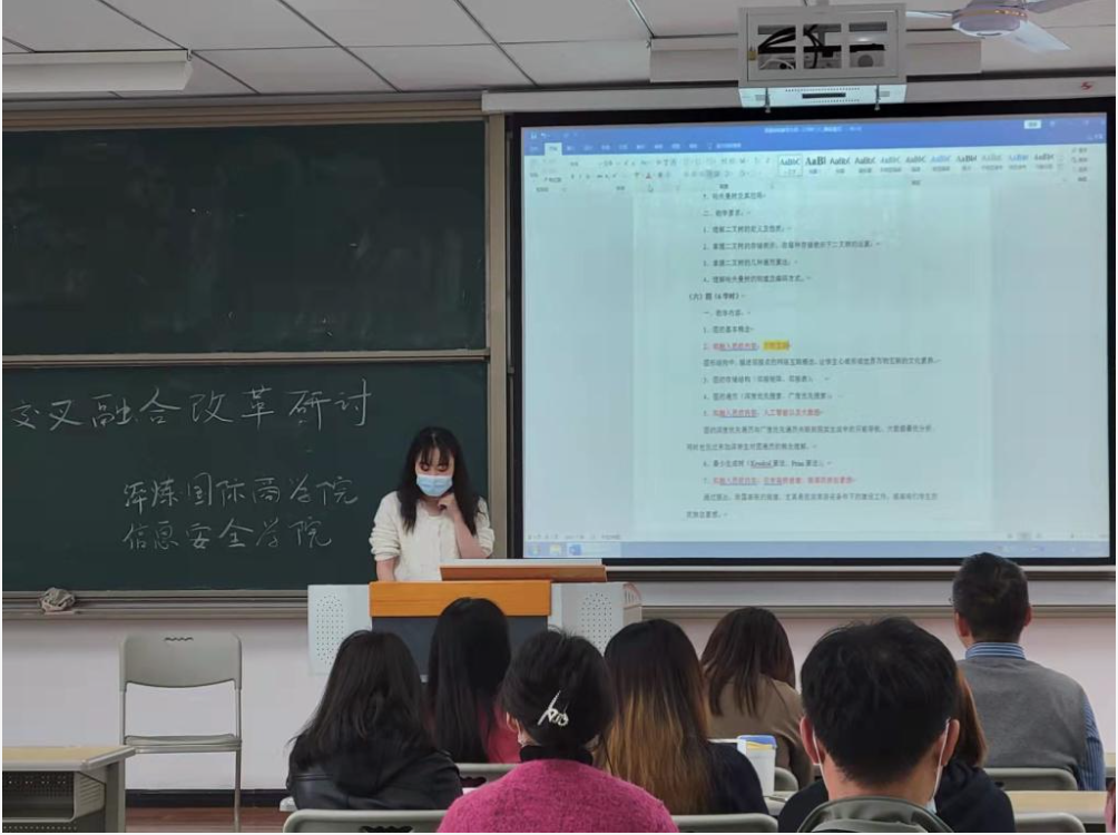 会议过半,信息安全学院的王宁副院长建议通过榜样和商业精英的案例做课程融合,学生的期末项目和学科竞赛是比较好的切入点,在项目过程中学生可以很好的将技术开发和管理链条相融合。信息安全学院的谢老师分析了商科与大数据板块相融合的可能性,他认为数据分析与数据可视化很有市场前景,可以作为课程融合的突破点。此外王院长倡导淬炼商学院和信息安全学院的老师们多互相听课,加强对彼此学科的了解。
