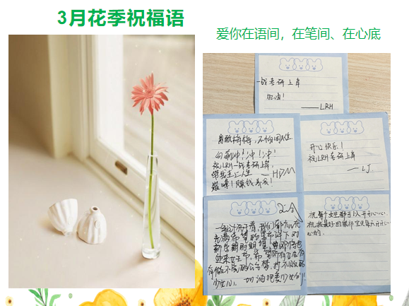 最后,依托3月花季,以“爱你在语间、在笔间、在心底”为旋律,师生共同写下了自己最美的期许,对家人、对老师、对同学、对友人、对恋人。生活亦是如此,在生活中发现最美的那个你,愿本学期的异科导师之旅,进一步帮助同学们发现最美好的自己。