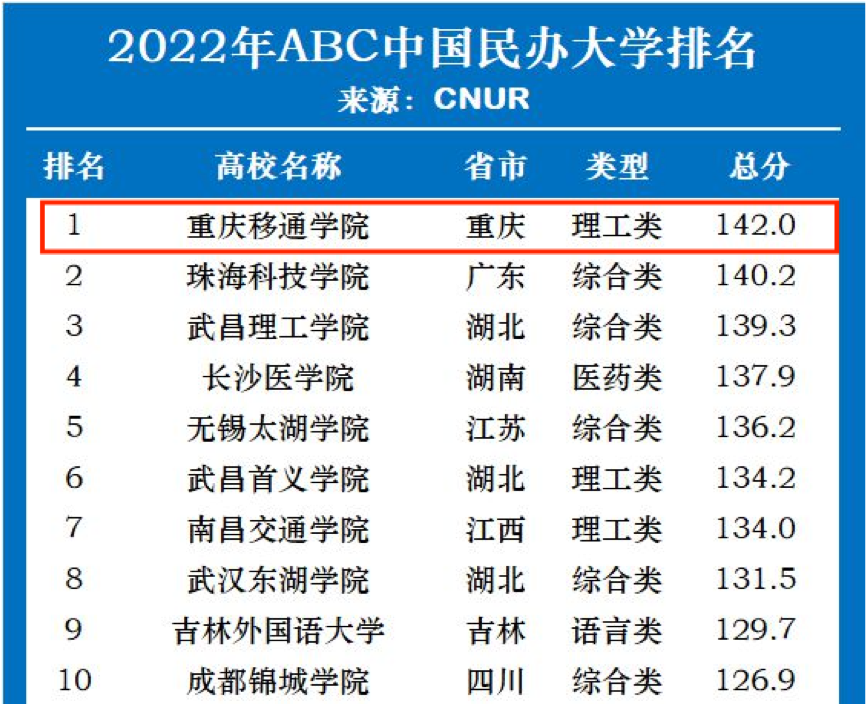2022年,重庆移通学院凭借在人才培养、社会影响力、教学建设、学术科研、素质教育和合作交流六大板块的综合实力,在ABC中国民办大学排名(原“中国民办大学百强榜”)中以142.0的总分位列全国民办大学第一。