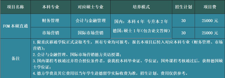 此项目是重庆移通学院唯一的本硕直通项目,现对本校已录取的所有在校生开放招生报名通道!报名本项目后转入对应本科专业,本科4年学习及相关课程由重庆移通学院国际商学院负责,配套雅思分层学习、管理课程强化学习、导师全程跟踪指导等帮助;1年的国外硕士培养由德国埃森经济管理应用技术大学(FOM大学)负责,配备资深德国专业教师、中文助教/翻译。国内课程考核通过并符合条件者可获得我校本科毕业证、学位证,国外课程考核通过后,可获得全球通用、中国教育部认可的文学硕士学位(Master of Arts)。