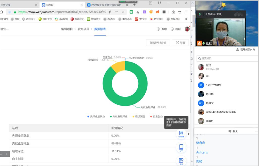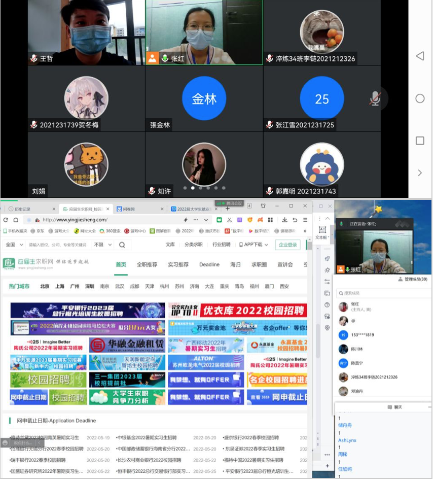 本次活动主要围绕就业形势解析、就业岗位方向及选择、就业心态及解疑答惑四个方面展开。首先,张红老师介绍了本次会议的目的、意义、参会的同学专业背景及教师情况。同时,张红老师围绕当前大学生的就业形势、应届毕业生去向、就业岗位等方面做了解析,推荐同学们关注应届生网,选取合适岗位。
